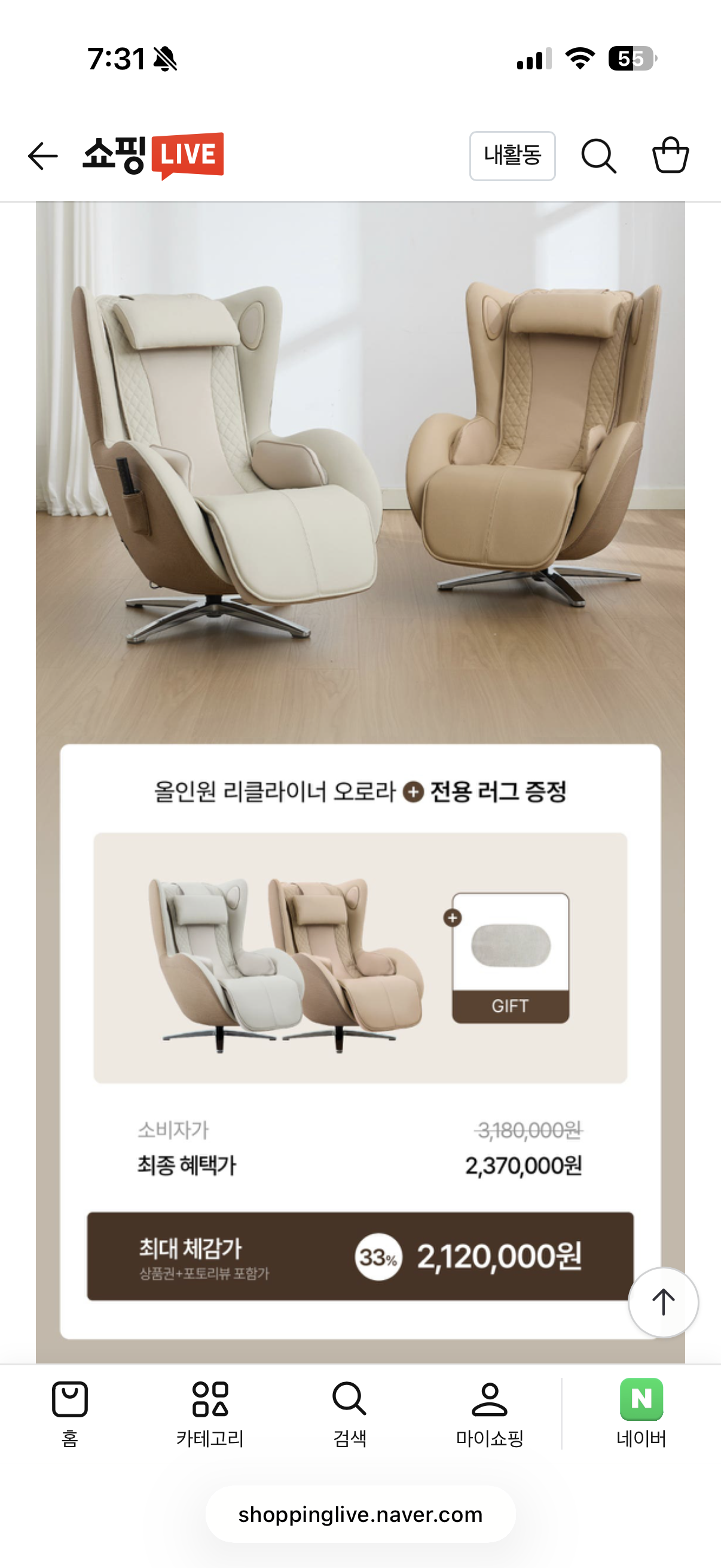 [네이버] 누하스 신상 리클라이너 안마의자 오로라 33%할인 (212만원/무료)