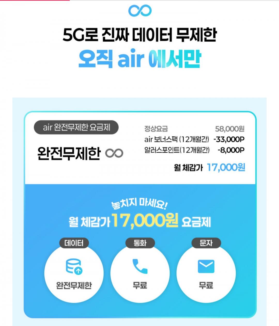 [11번가] SKT AIR 완전무제한 요금제 12개월 (17,000원/무료)