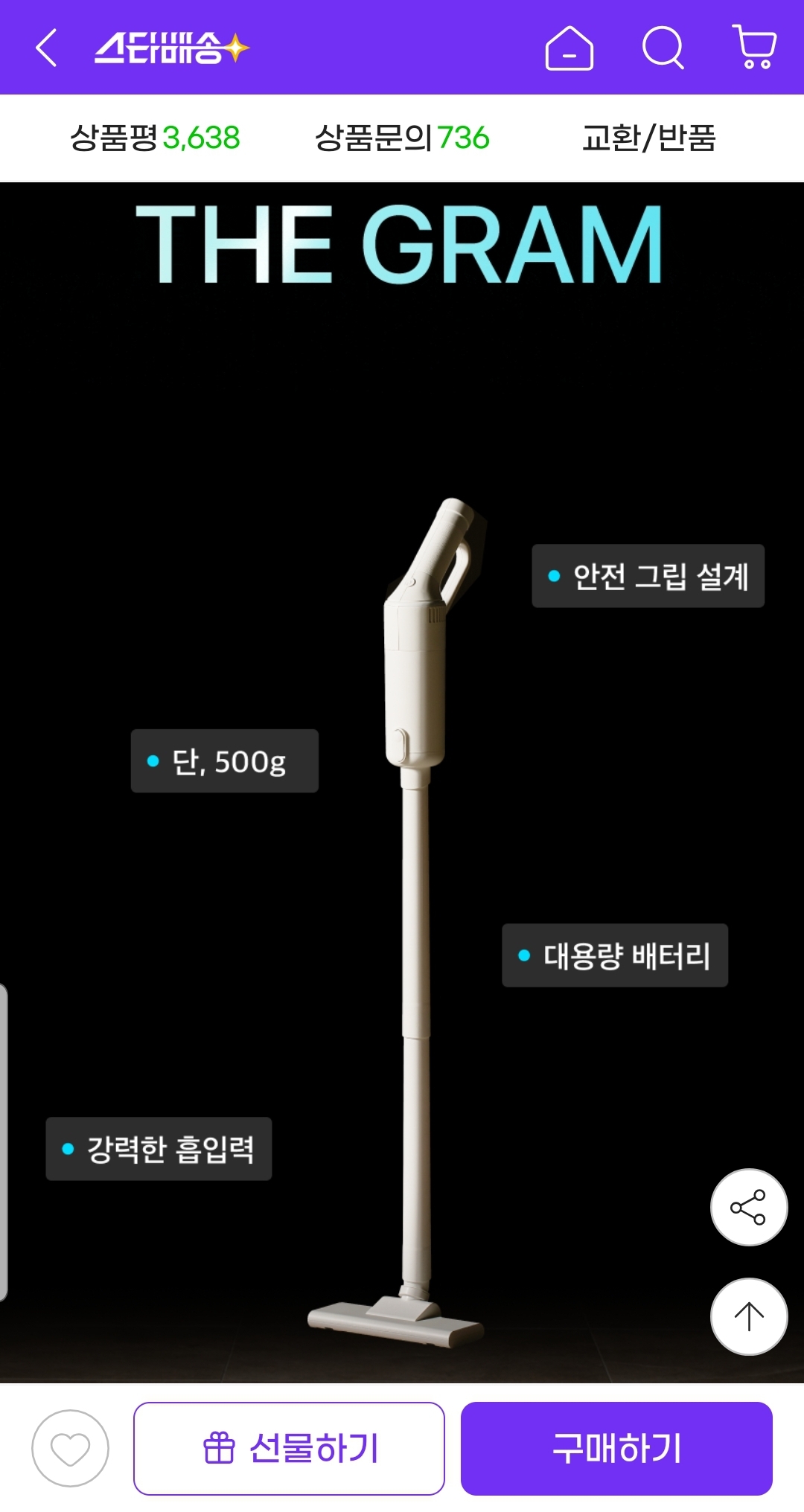 500g 초경량 무게에 좋은 흡입력으로 구석구석 청소하기 편합니다.