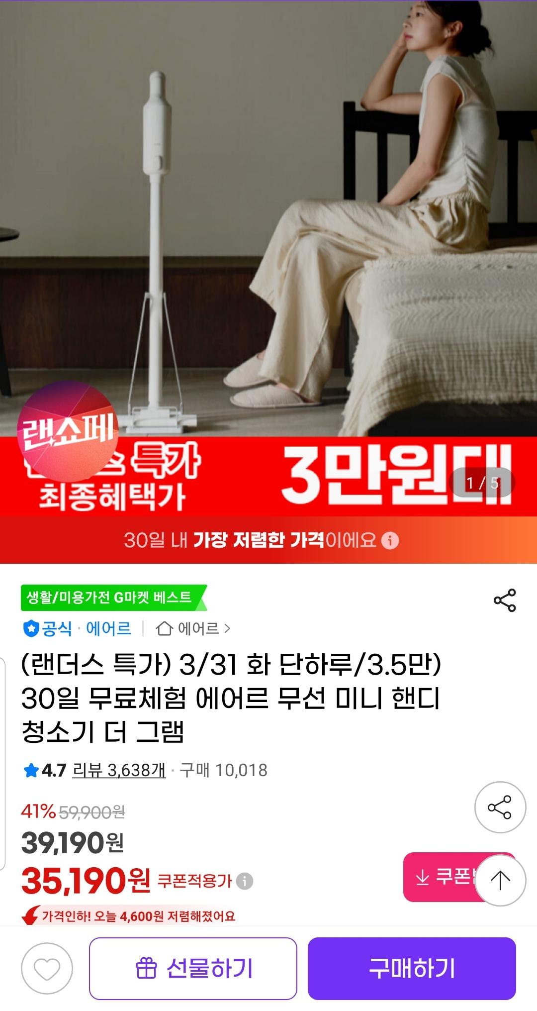 [G마켓] 에어르 더 그램 무선 핸디 청소기 (35,190원/무료)