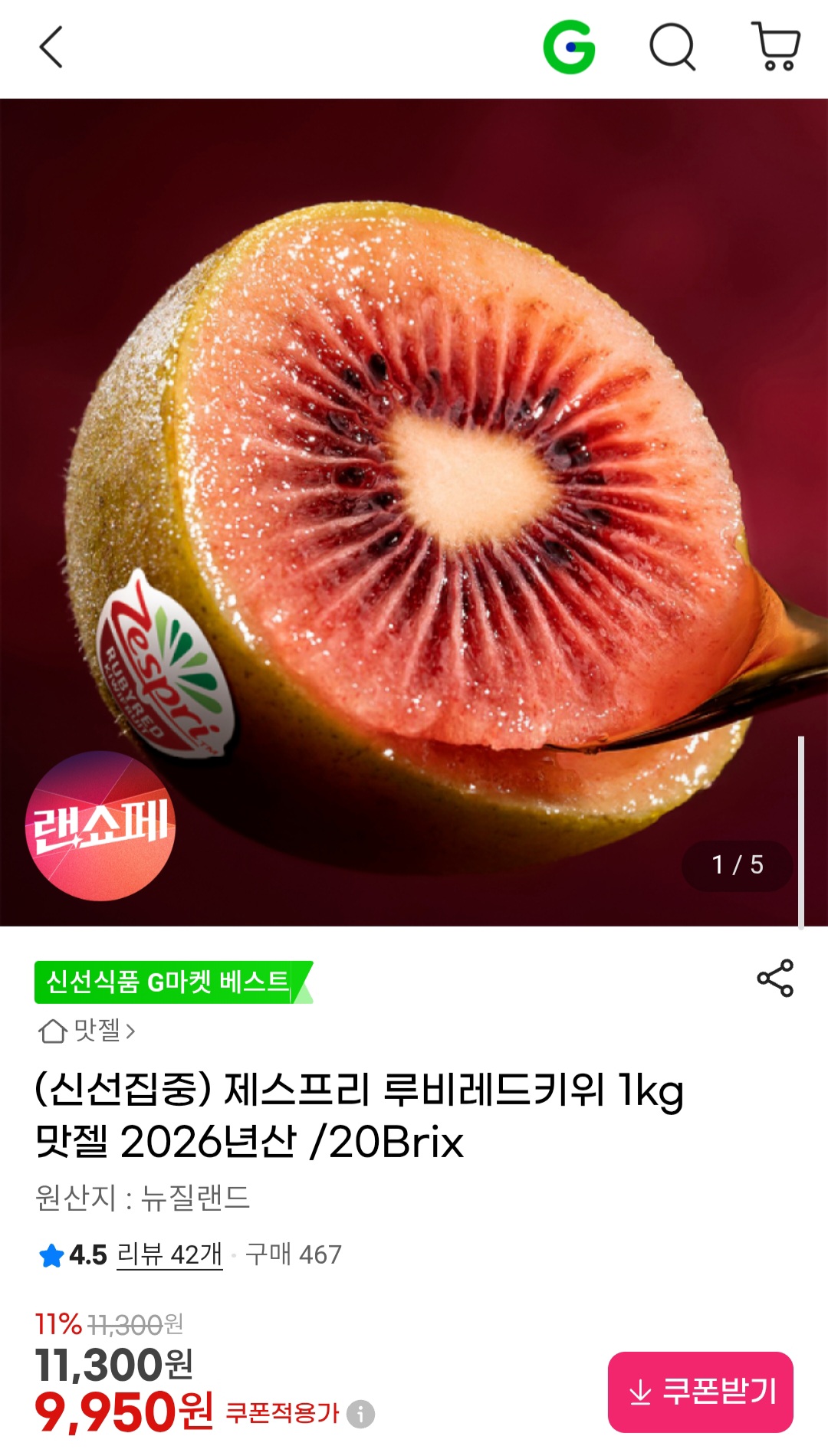 제스프리 루비레드키위 1kg 맛젤 2026년산 9950원으로 떴는데 가격 좋네요
