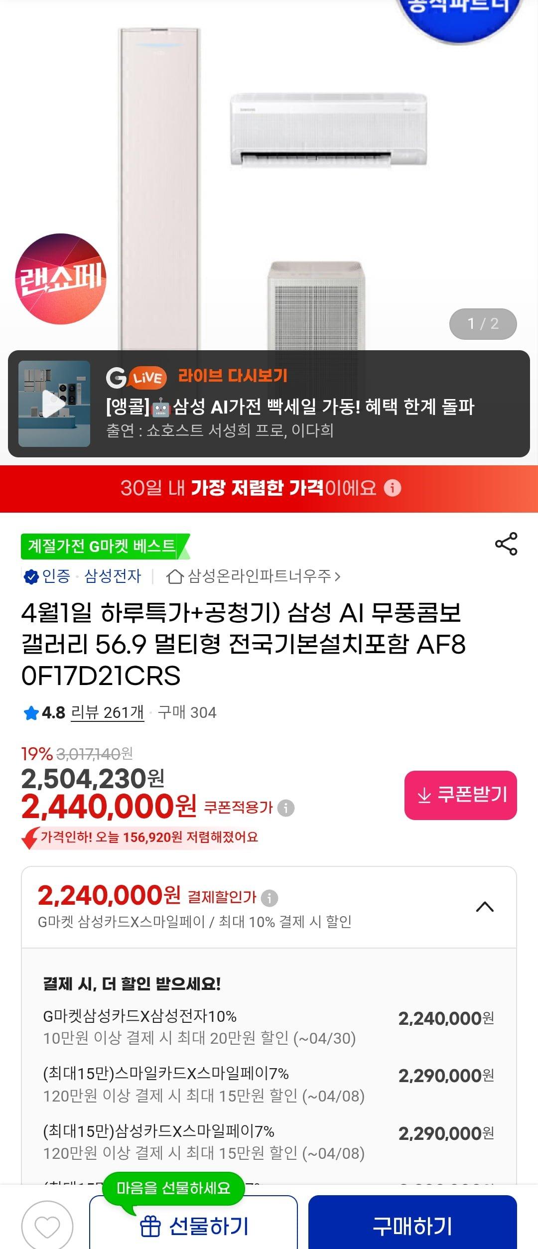 상품권이랑 스마일캐시 받으면 체감가 228만원 나오는데