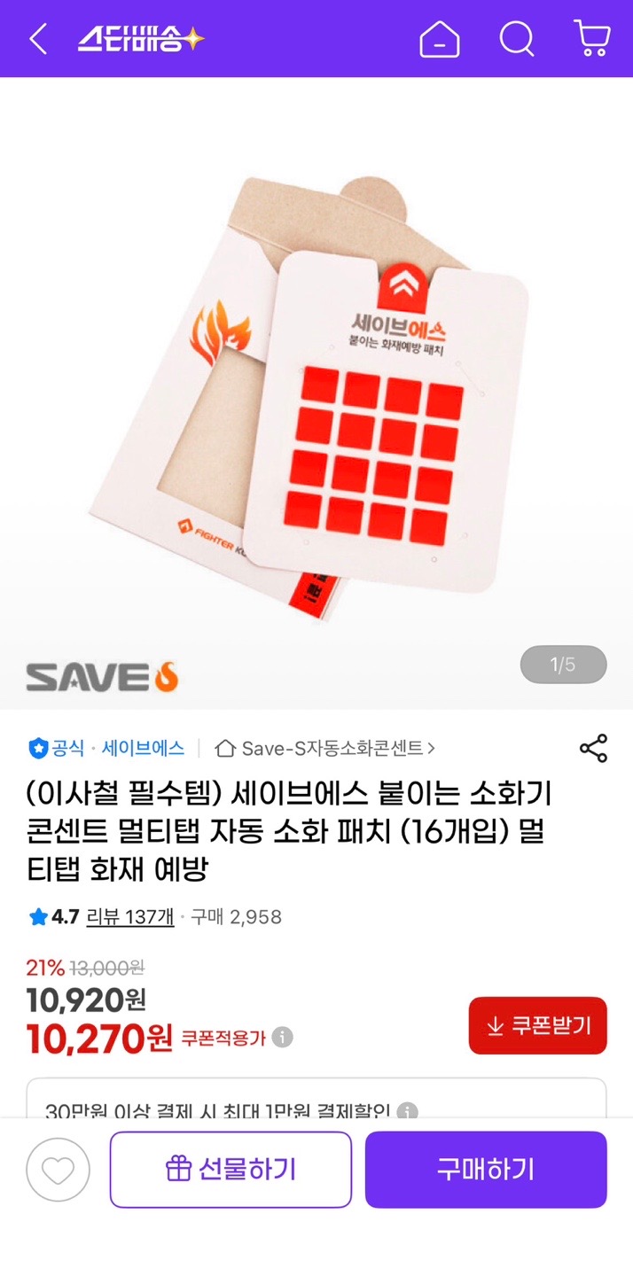 [지마켓] 세이브에스 붙이는 콘센트 멀티탭 소화기 자동소화패치 16개입 (10,270원/3,000원)