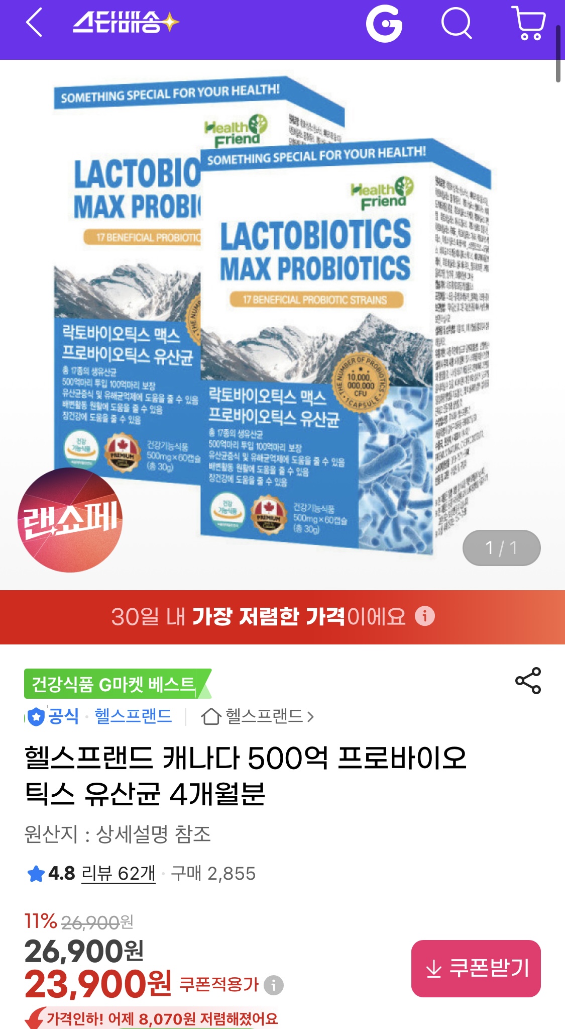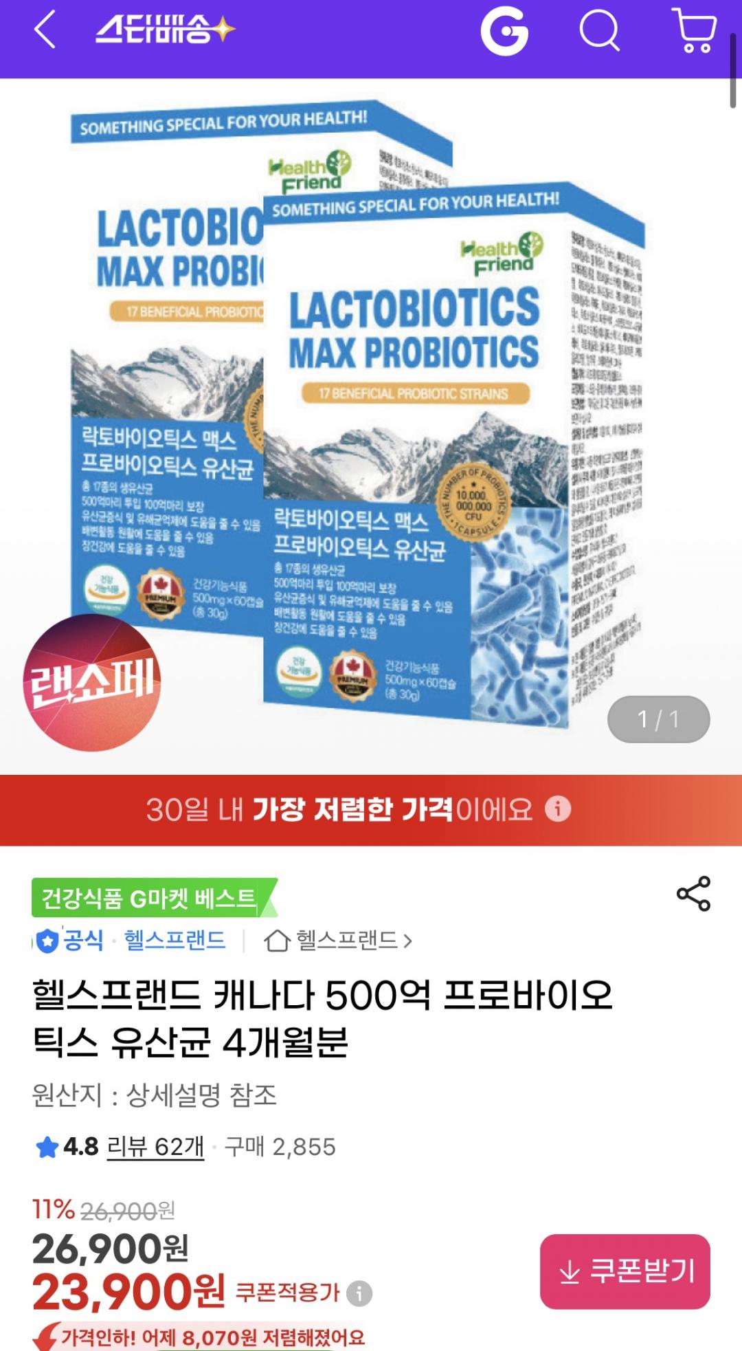 [지마켓] 캐나다 프로바이오틱스 500억 모유 생유산균 4개월분 (23,900원/무료) > 국내핫딜