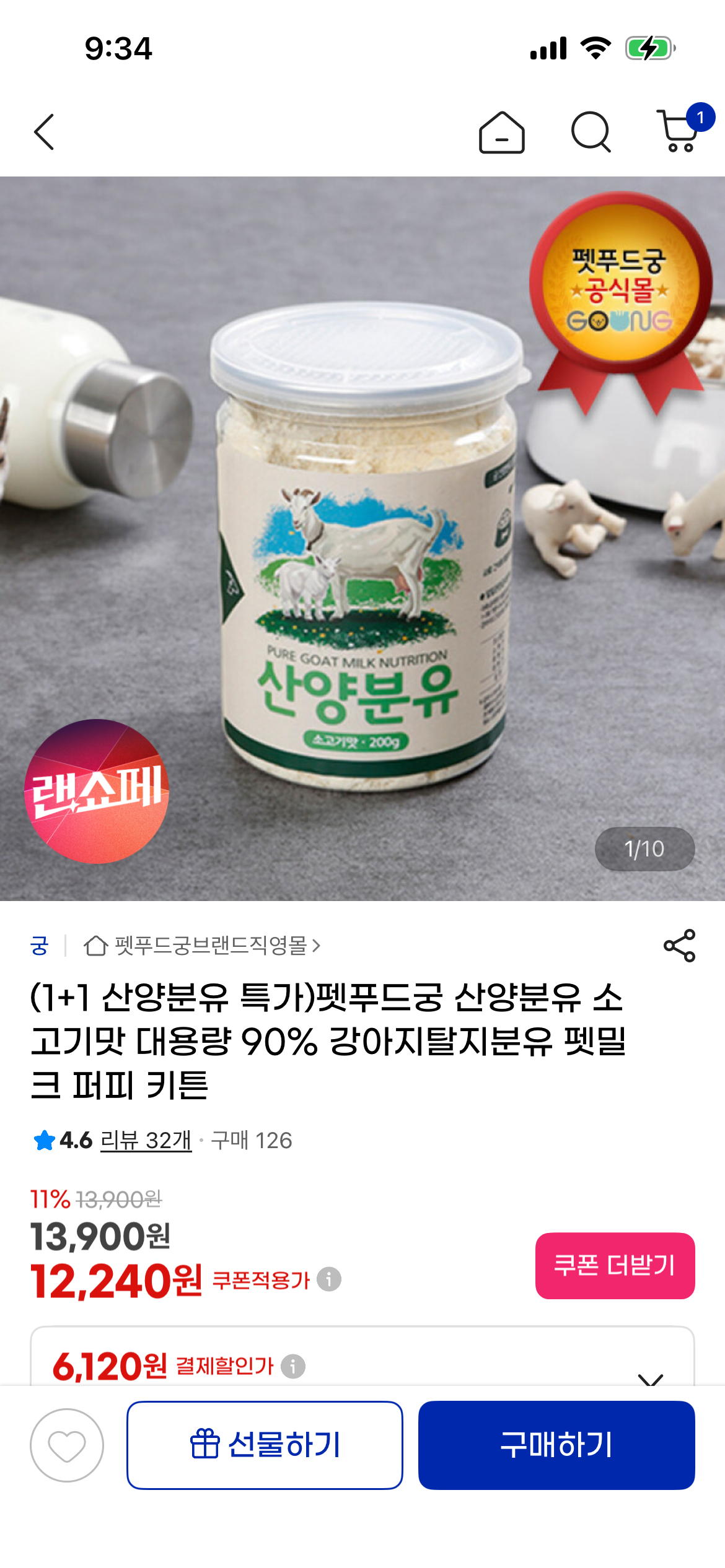 [지마켓] 펫푸드궁 산양분유 소고기맛, 가쓰오부시맛 대용량 1+1 (12,240원/무배) > 국내핫딜