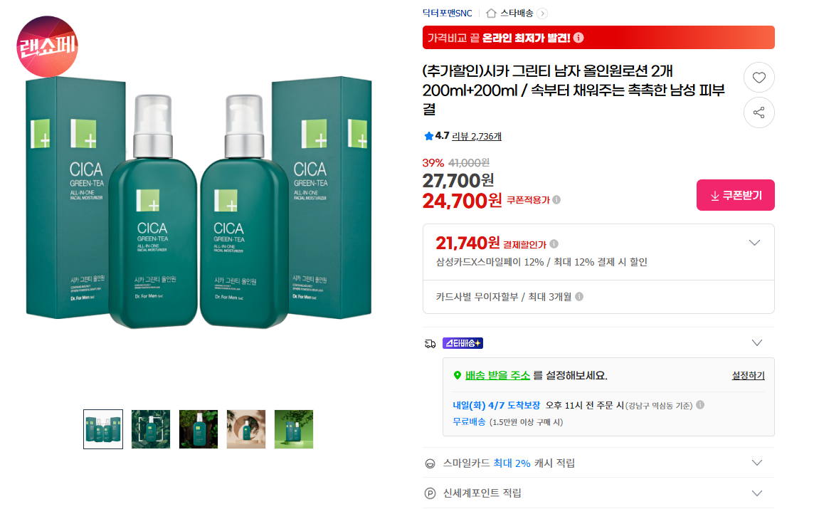 1+1 구성에 무료배송이라 개당 12,000원 꼴인데, 현재 랜쇼페 행사 혜택까지 더해져 가격 메리트가 상당히 좋습니다.