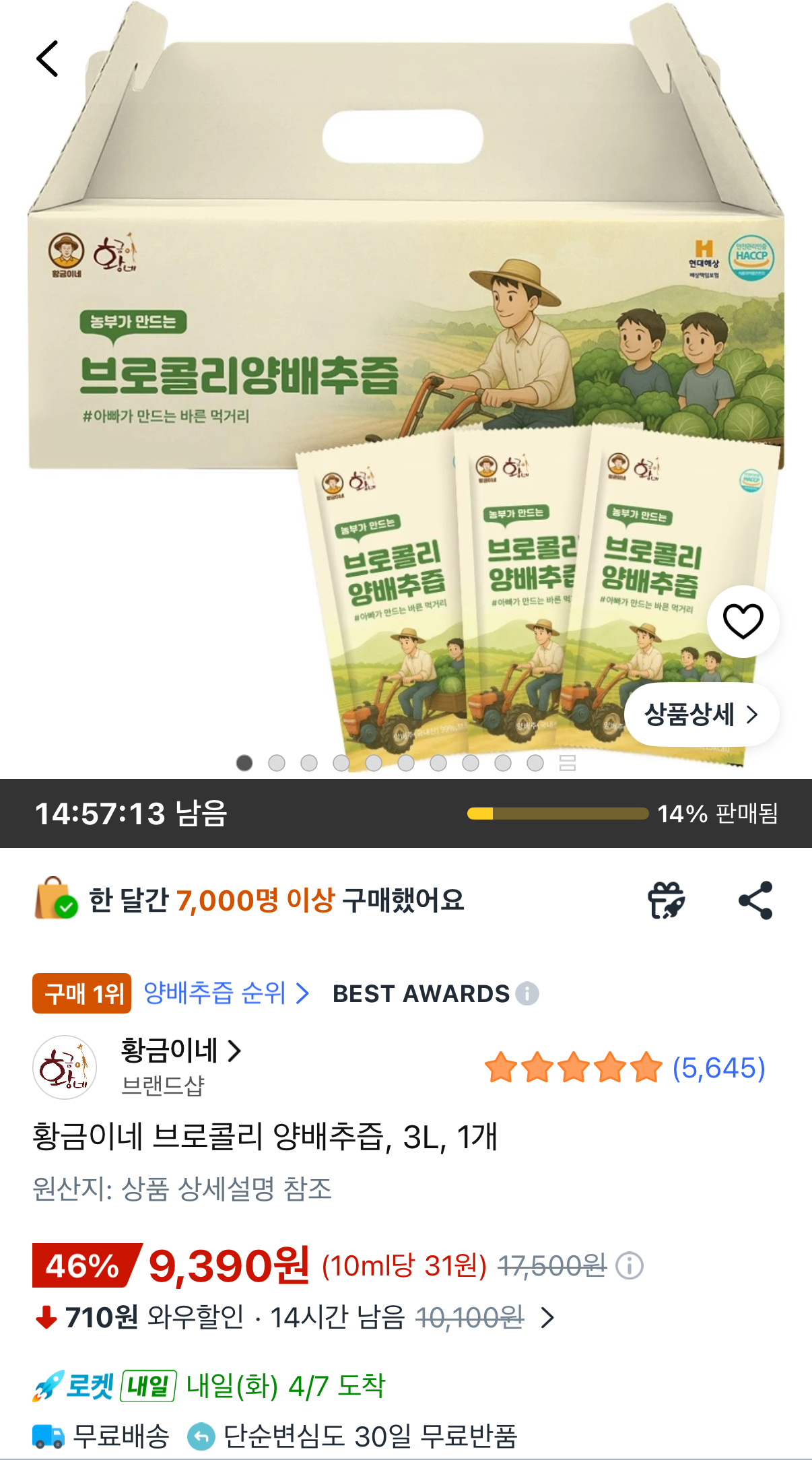 [쿠팡] 황금이네 브로콜리 양배추즙 3L 1개 (9,390원/무배)
