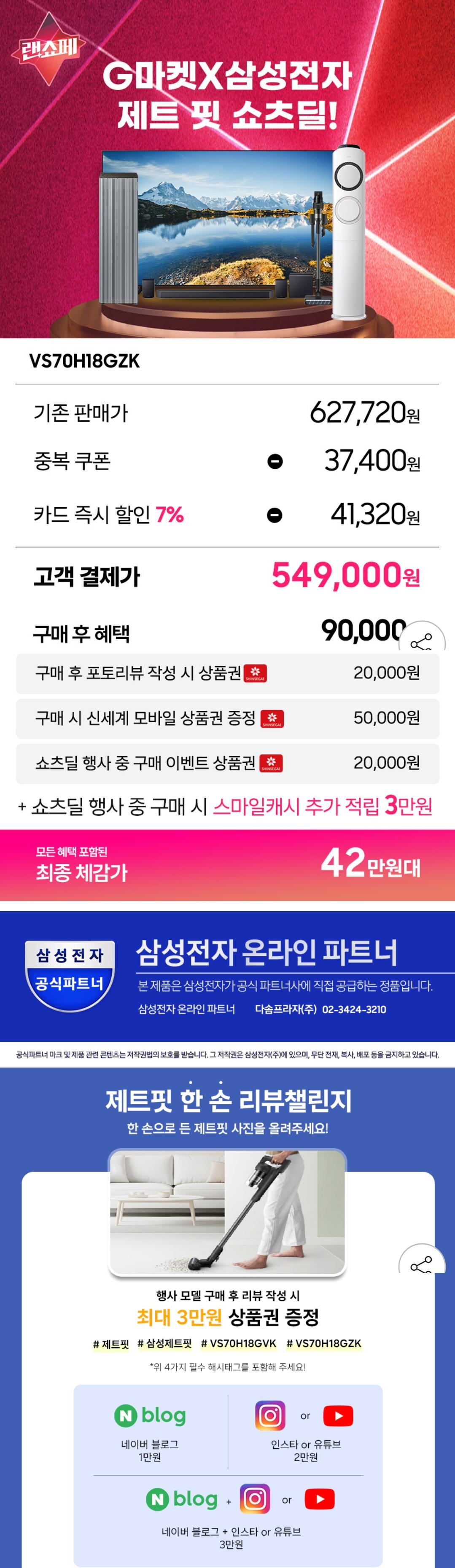 [G마켓]삼성 제트 핏 180W 무선청소기 VS70H18GZK 새틴블랙(549,000원/무료) > 국내핫딜