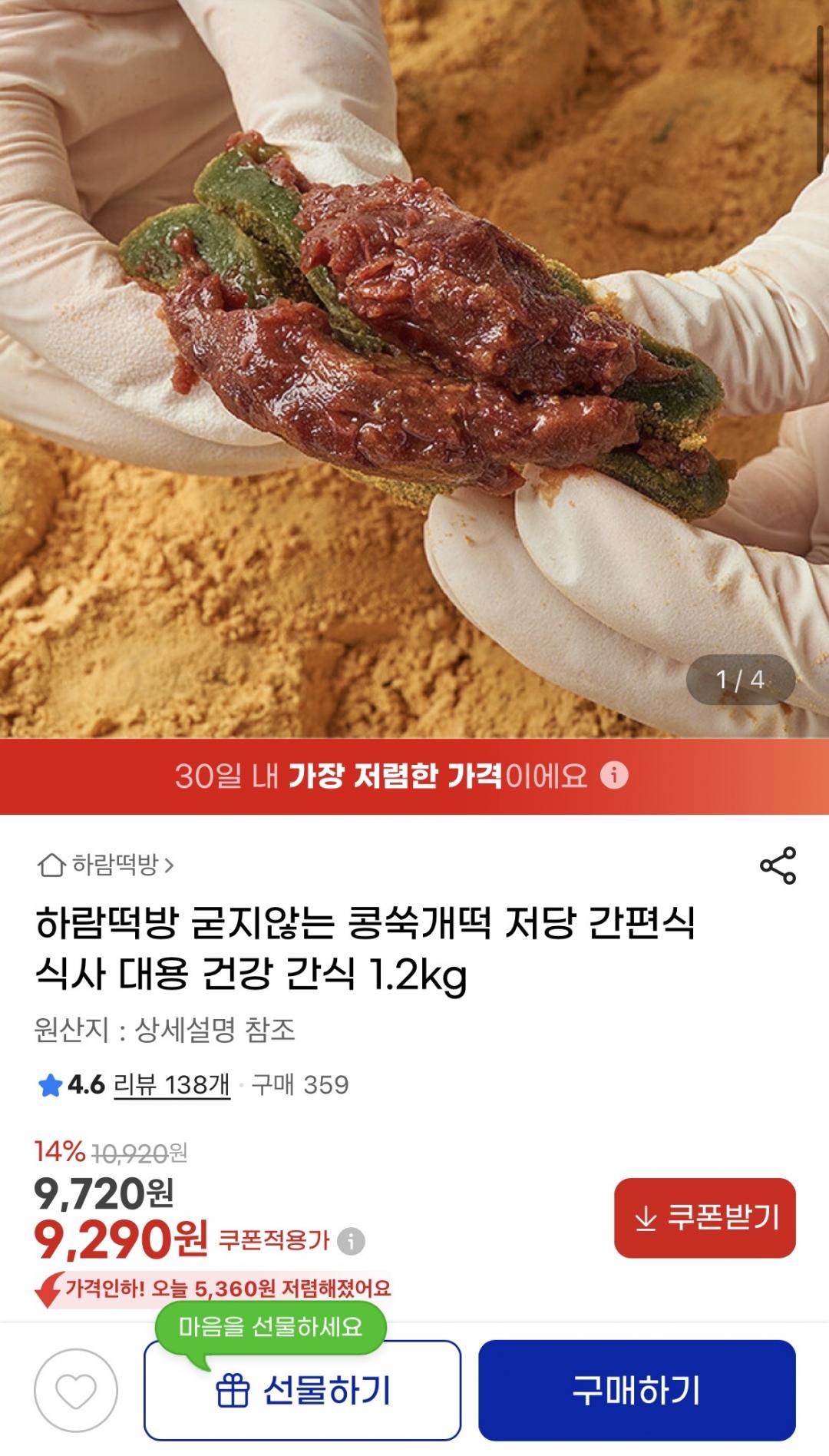 부모님께 간식으로 드리려고 자주 주문하는 굳지않는 콩쑥개떡입니다