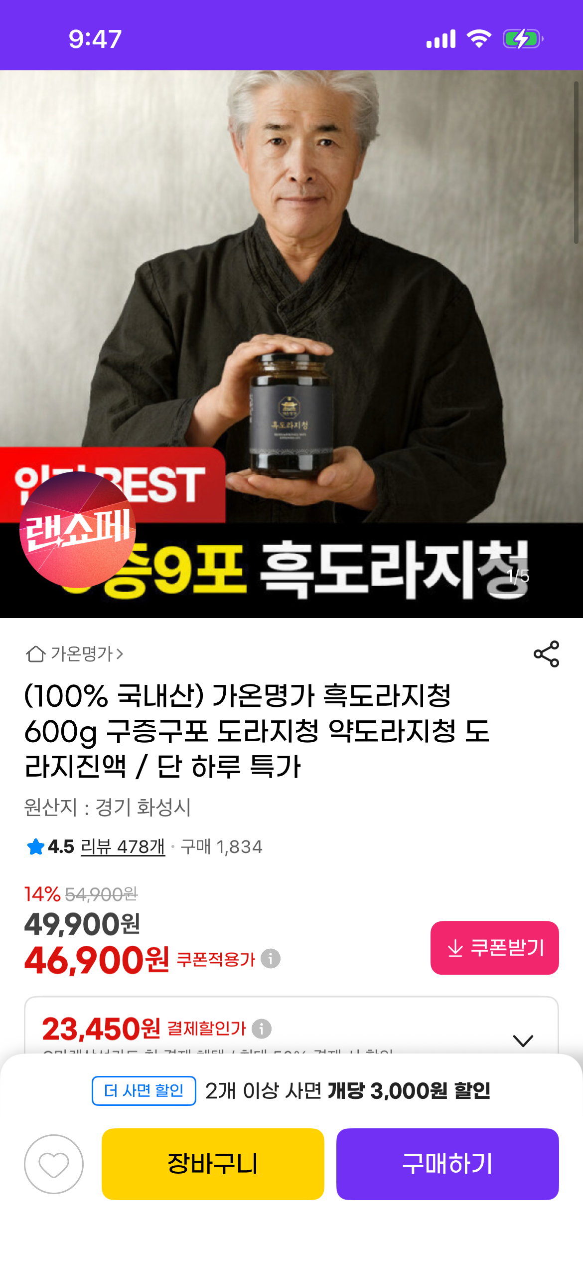 [지마켓] 흑도라지청 600g 구증구포 도라지청 (46,900원/무료)