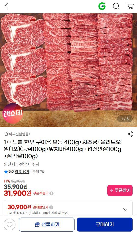 [지마켓] 1++투뿔 한우 구이용 모듬 400g (32,900원/무배) > 국내핫딜