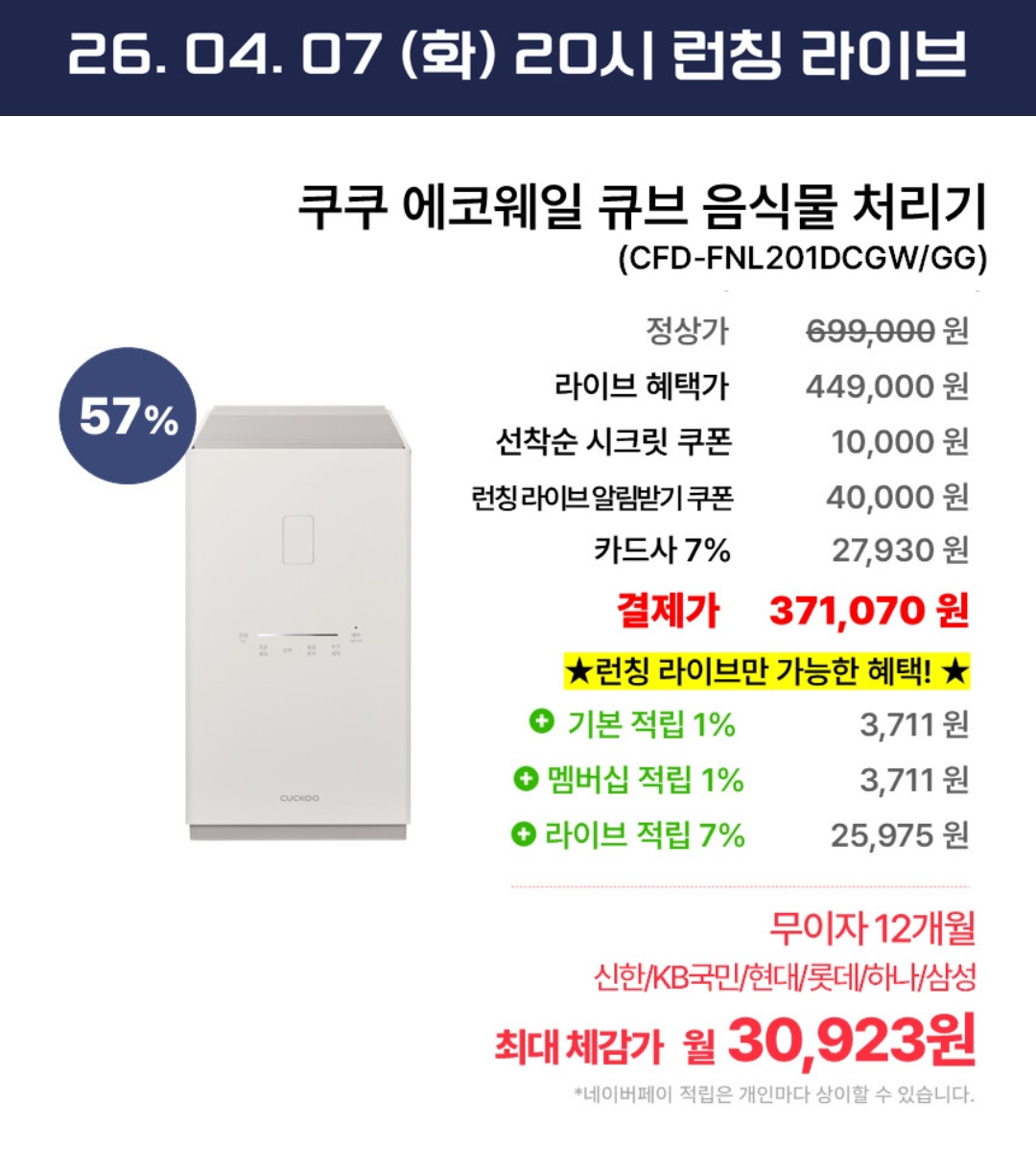 네이버 라이브로 쿠쿠 2L 음처기 특가떴네요