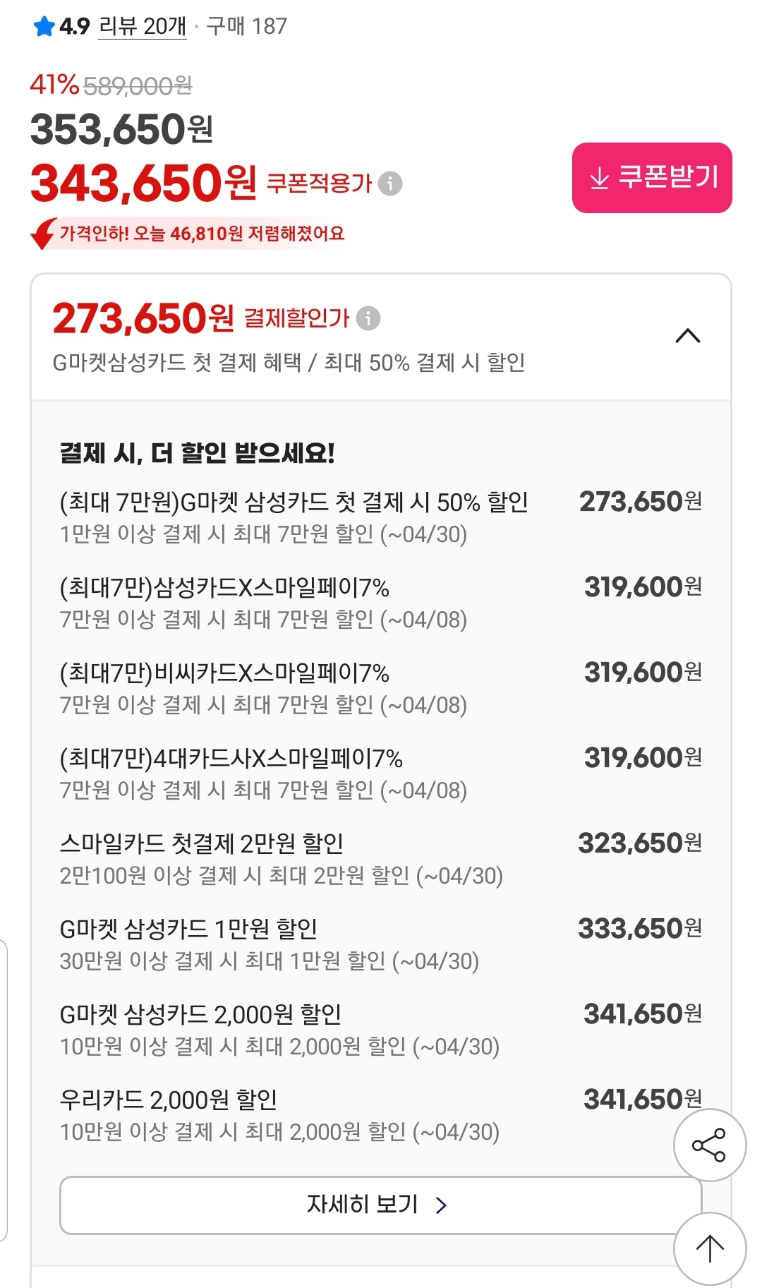 스마일페이 2만원 증정이라 체감 29만정도로 싼편입니다