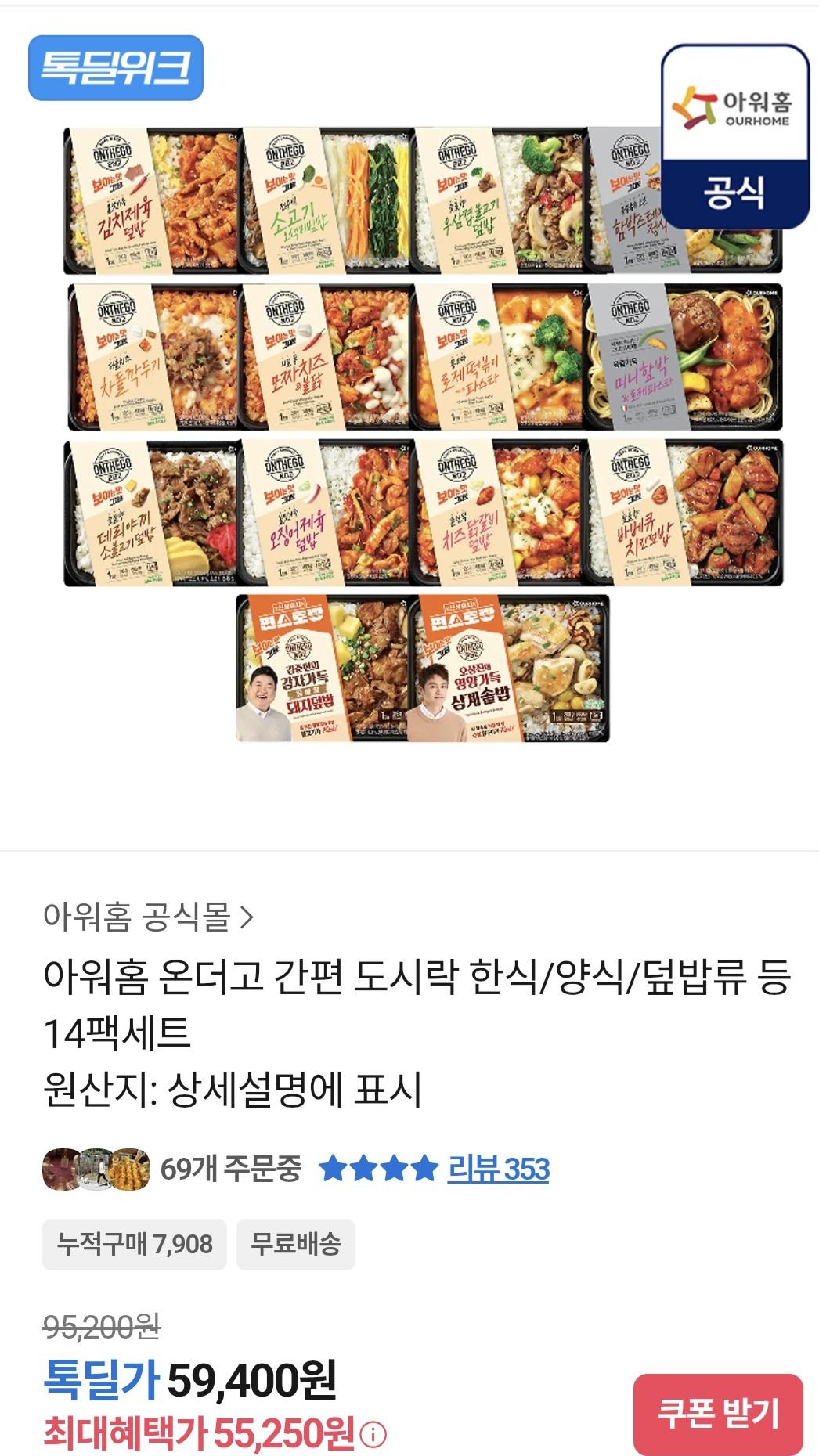 [톡딜]아워홈 온더고 간편 도시락 한식/일식/양식/덮밥류 14팩 세트 (55,250원/무료) > 국내핫딜