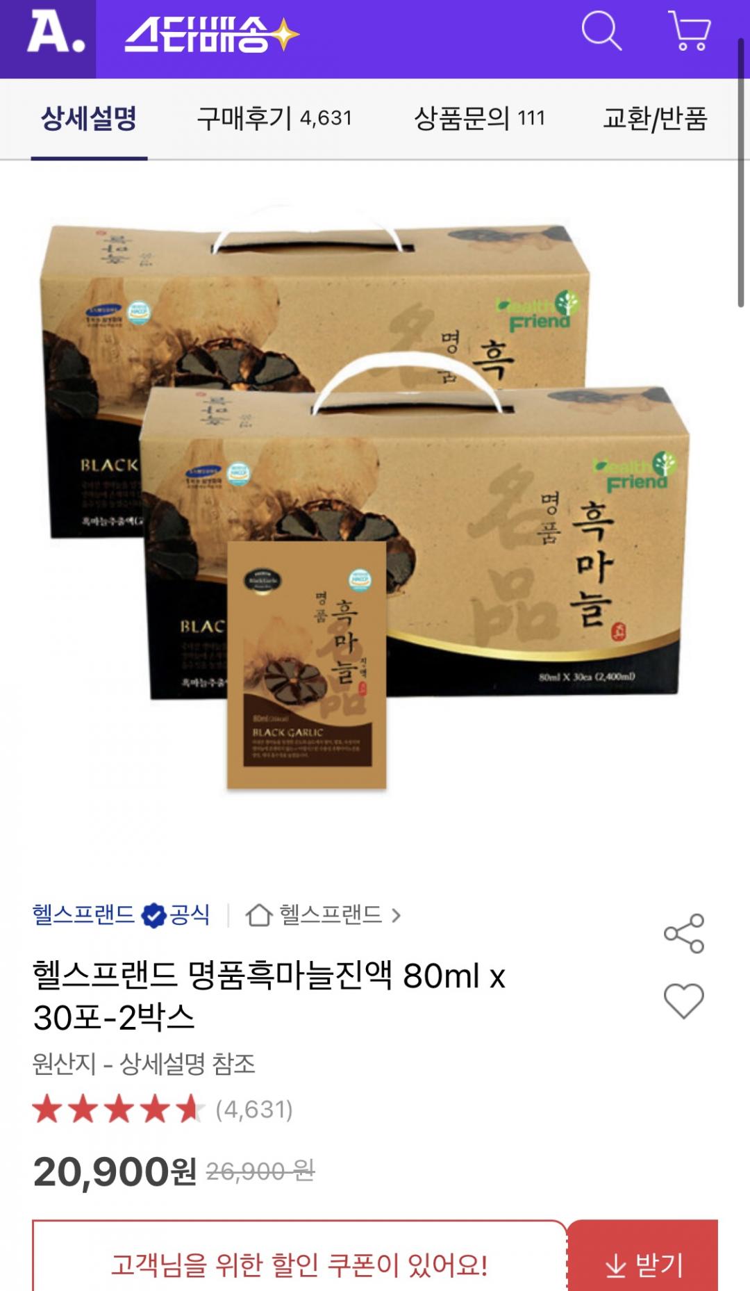 [옥션] 흑마늘 추출액 94%이상 흑마늘진액 80ml x 30포-2박스 총60포 (20,900원/무배) > 국내핫딜