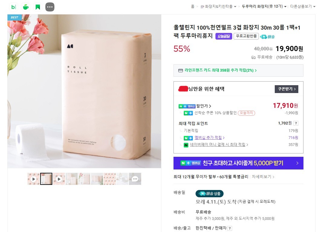 [네이버] 올챌린지 3겹 화장지 30m 30롤 2팩 (17,910원 / 무료)