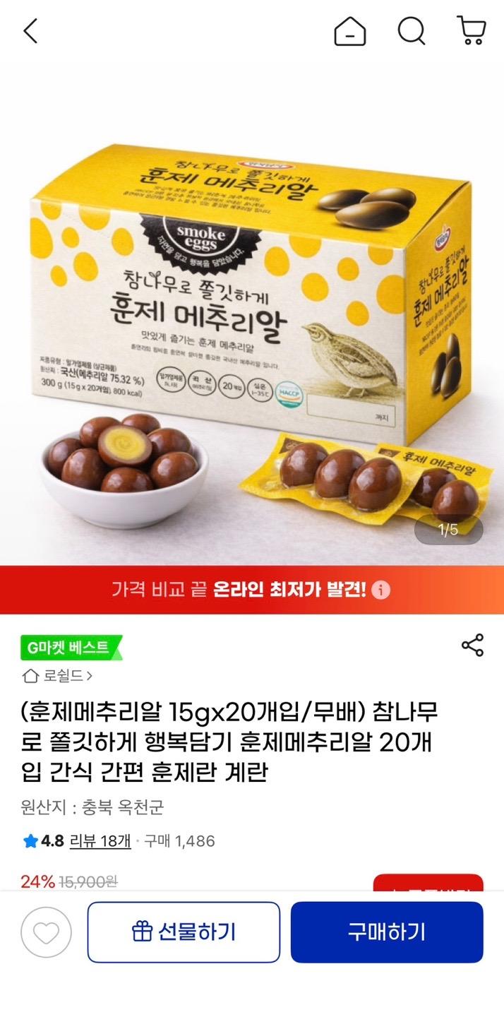 [지마켓] 참나무로 쫄깃하게 훈연한 훈제 메추리알 20개입 (12,470원/무배) > 국내핫딜