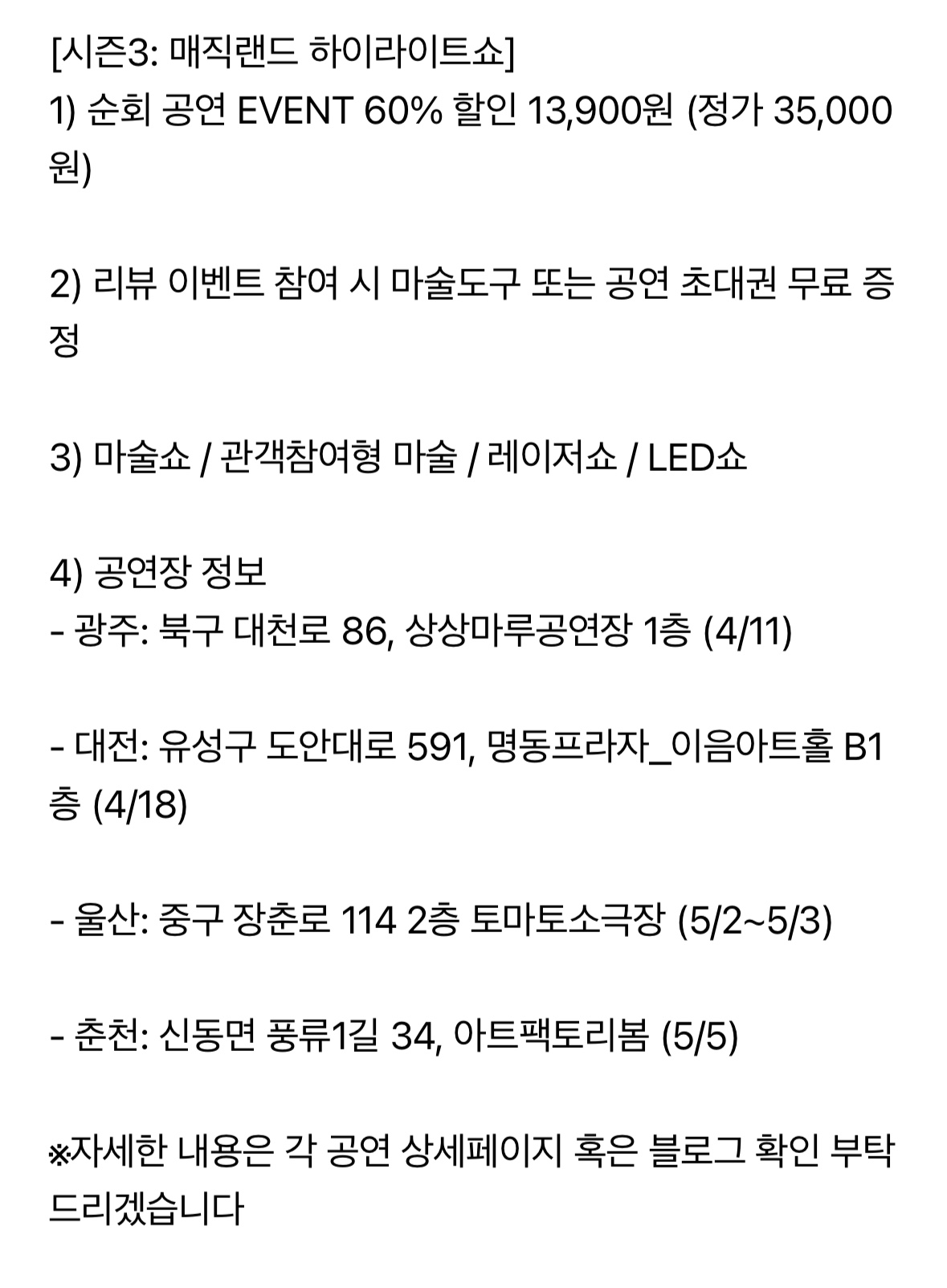 주말에 순회하면서 광주/울산/춘천/대전에서 마술쇼하는데 이번 토욜은 광주에서 해요