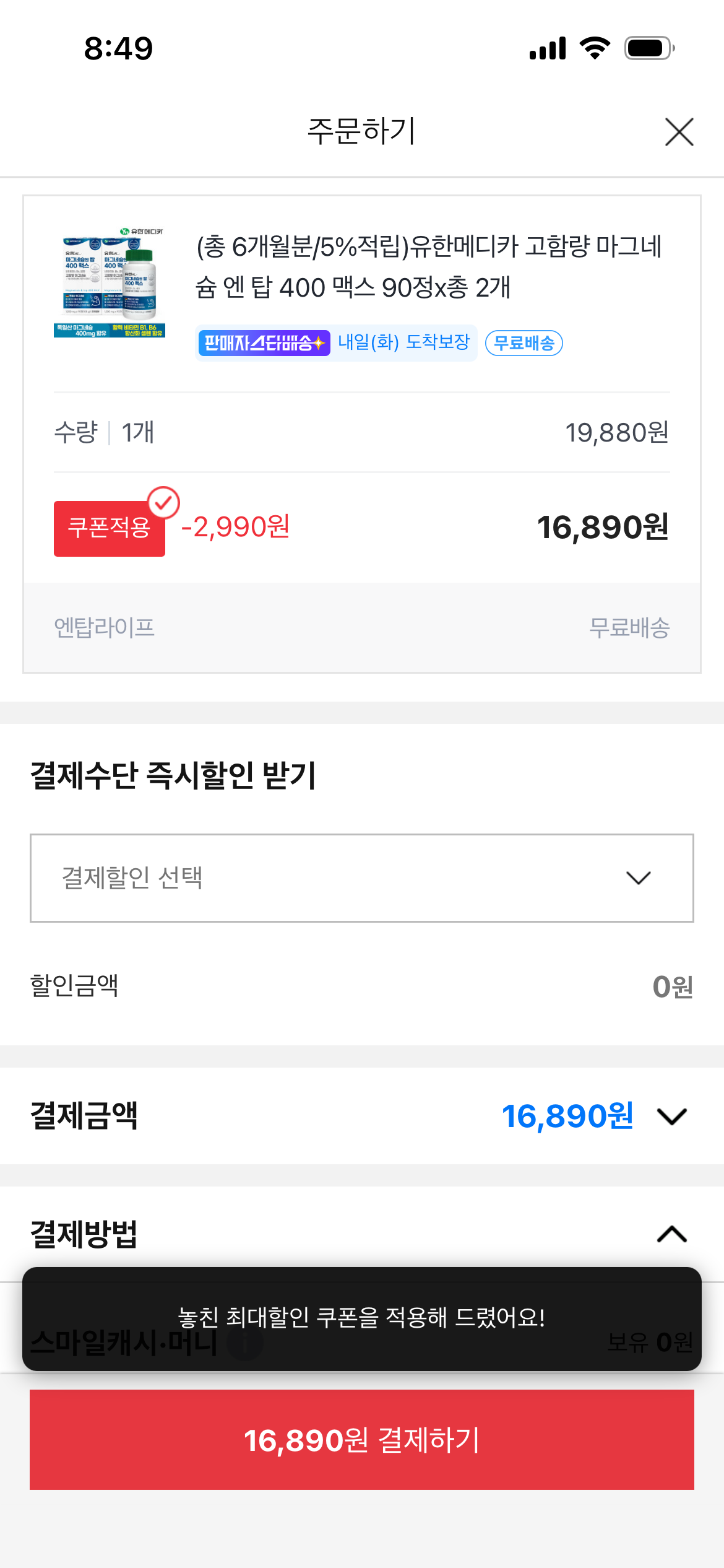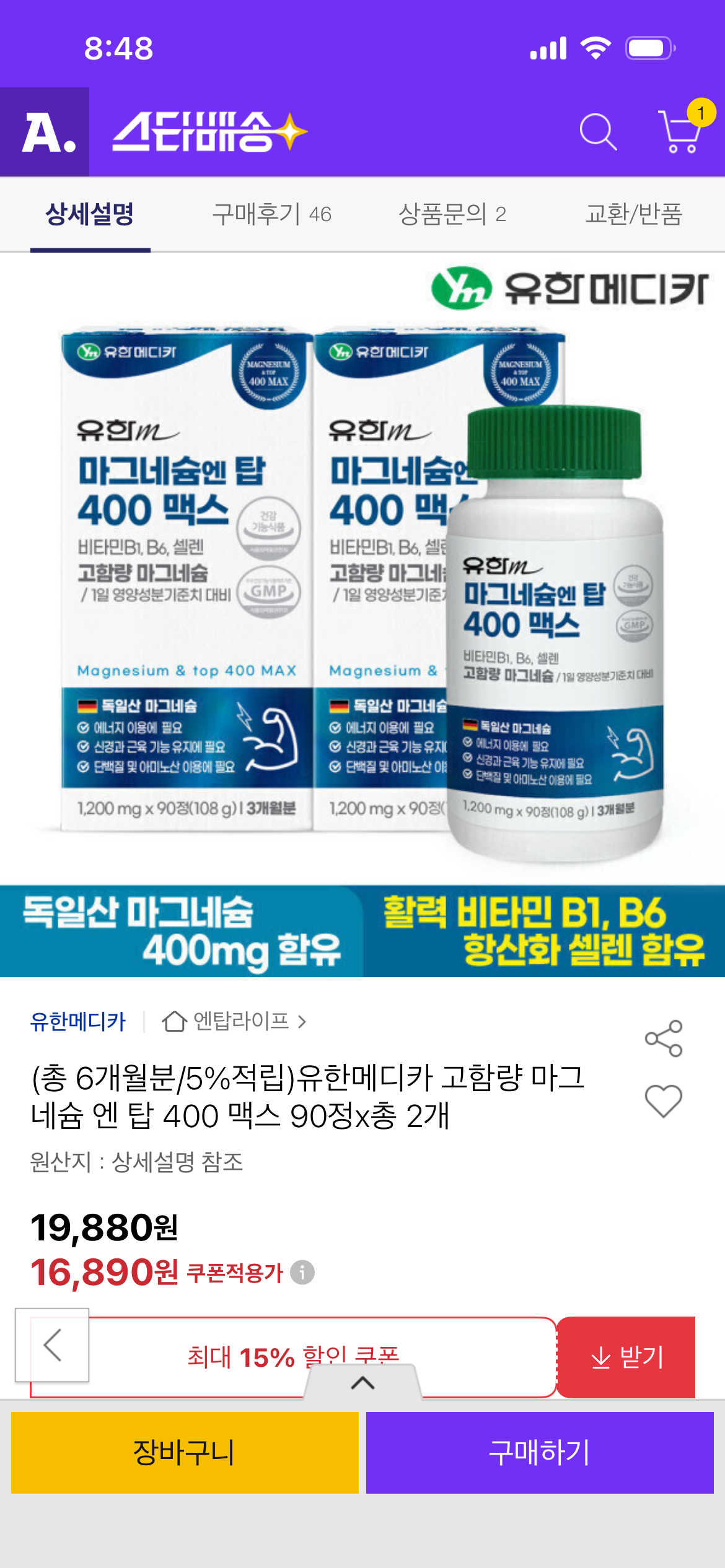 [옥션] 유한메디카 고함량 마그네슘 엔 탑 400 맥스 90정x총 2개 (16,890원/무료)