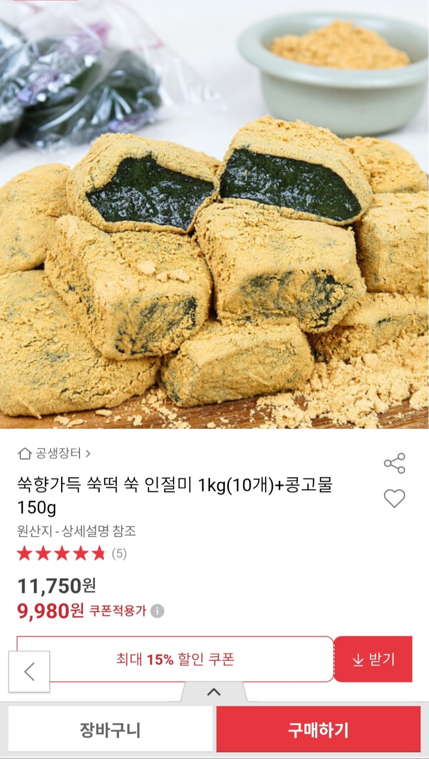 [옥션] 쑥향가득 쑥 인절미 1kg(10개)+콩고물 150g (9,980원 / 무료배송) > 국내핫딜