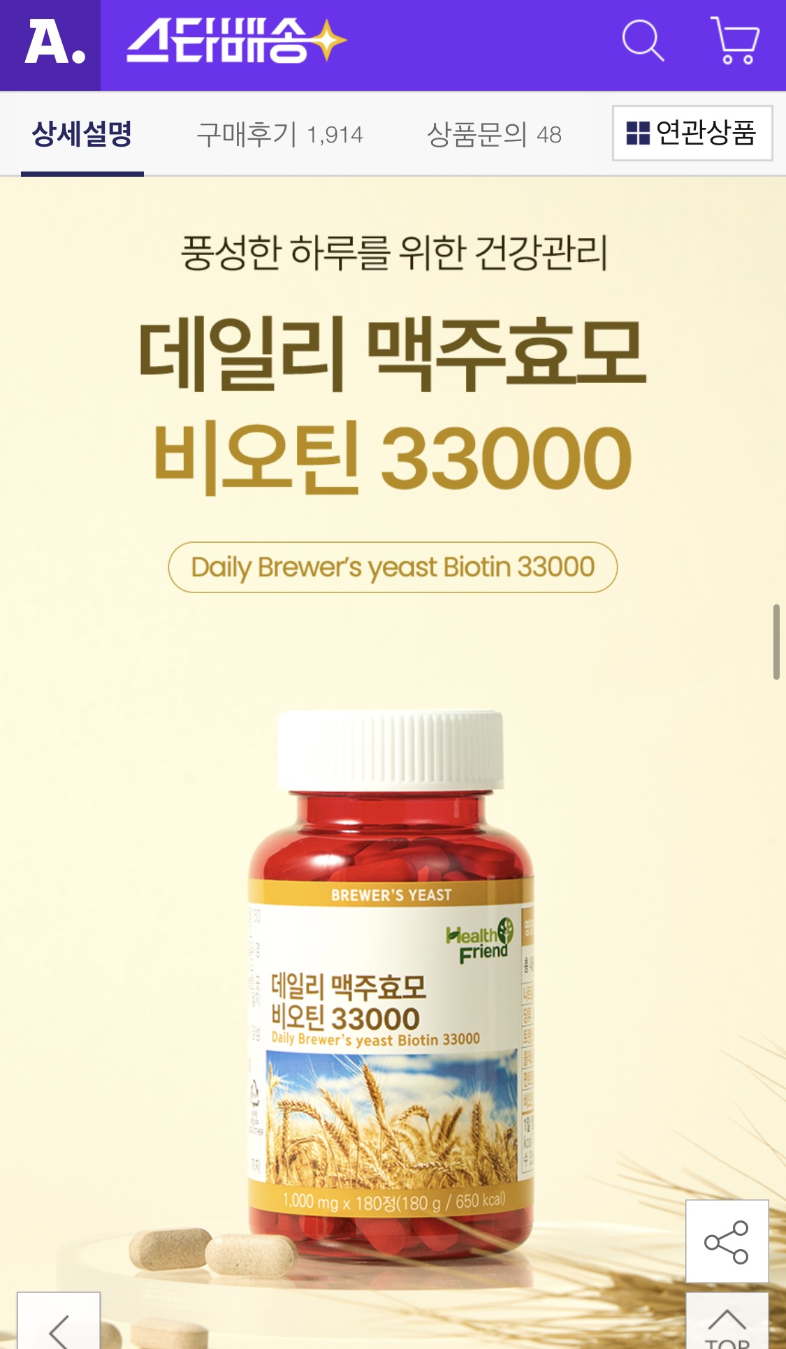 맥주 효모 46.7% / 비오틴 33,000% 함량 높고 가성비 저렴합니다