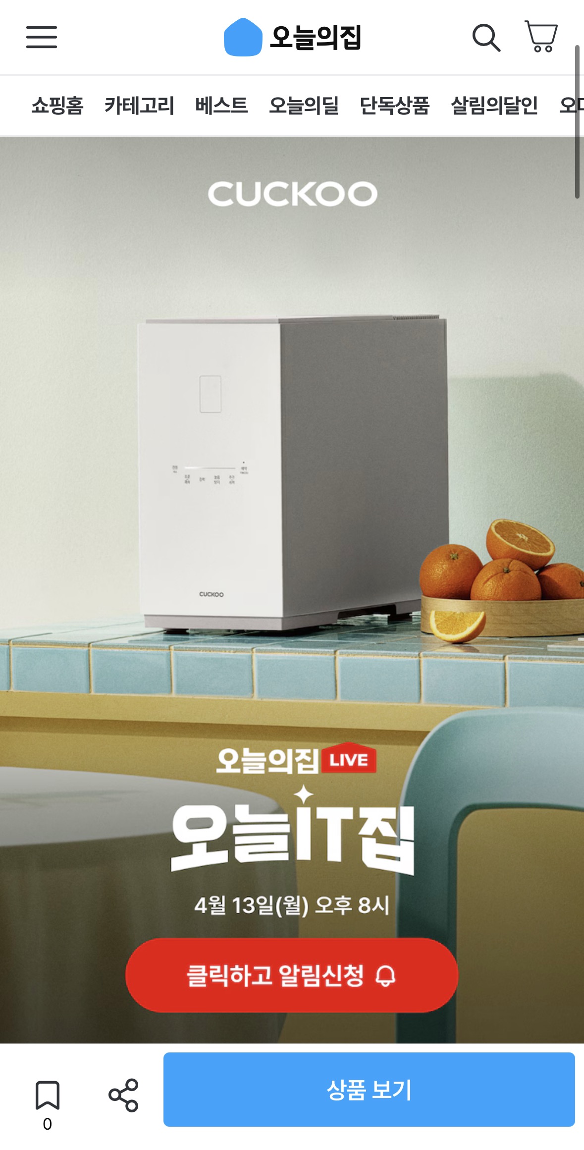 8시에 오늘의집에서 쿠쿠 음식물처리기 런칭 라이브방송 하네요