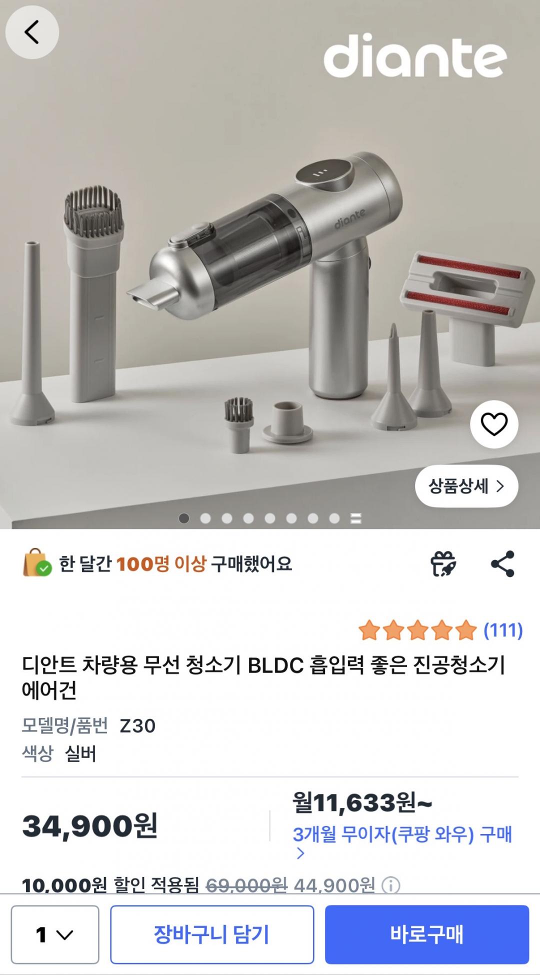 디안트 차량용청소기가 BLDC모터에 34,900원이네요