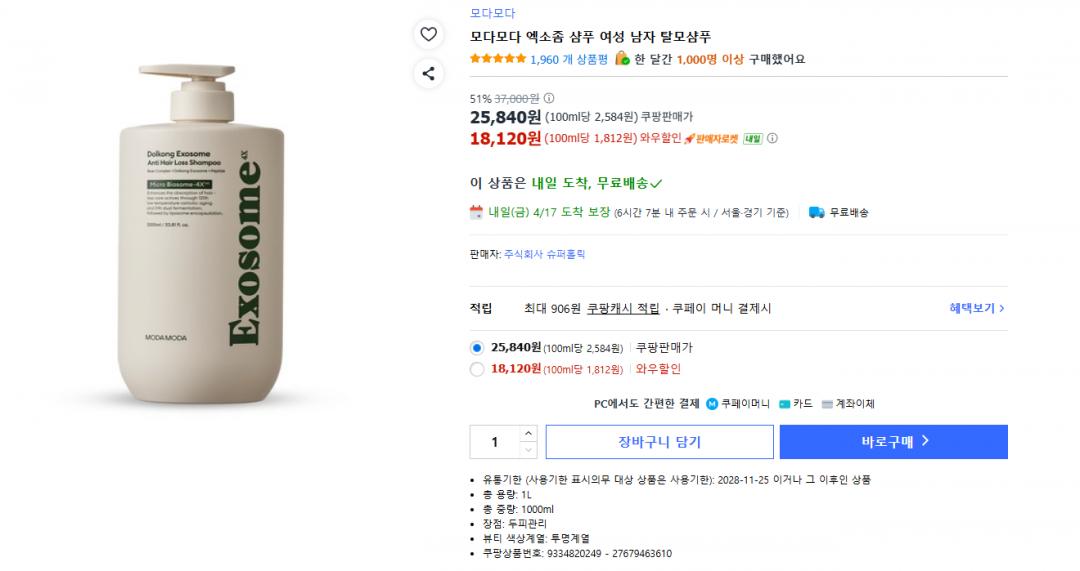 [쿠팡] 모다모다 돌콩 탈모완화 기능성샴푸 1000ml 18,120원 무배