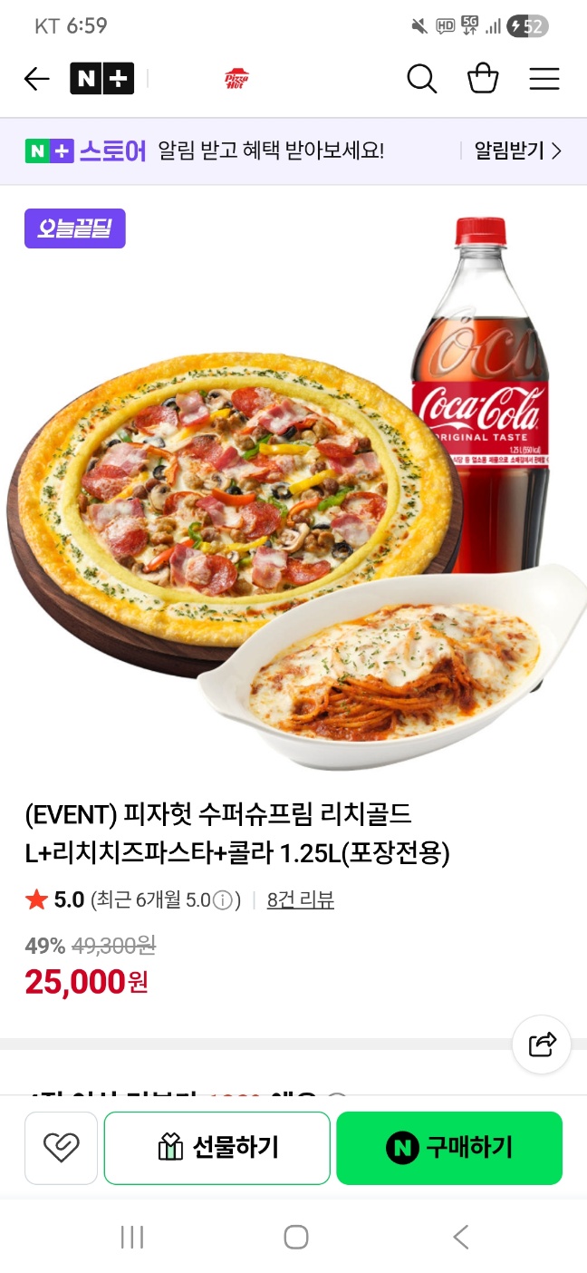 [네이버] 피자헛 수퍼슈프림 리치골드 L+리치치즈파스타+콜라 1.25L(포장전용) (25,000원/무료)
