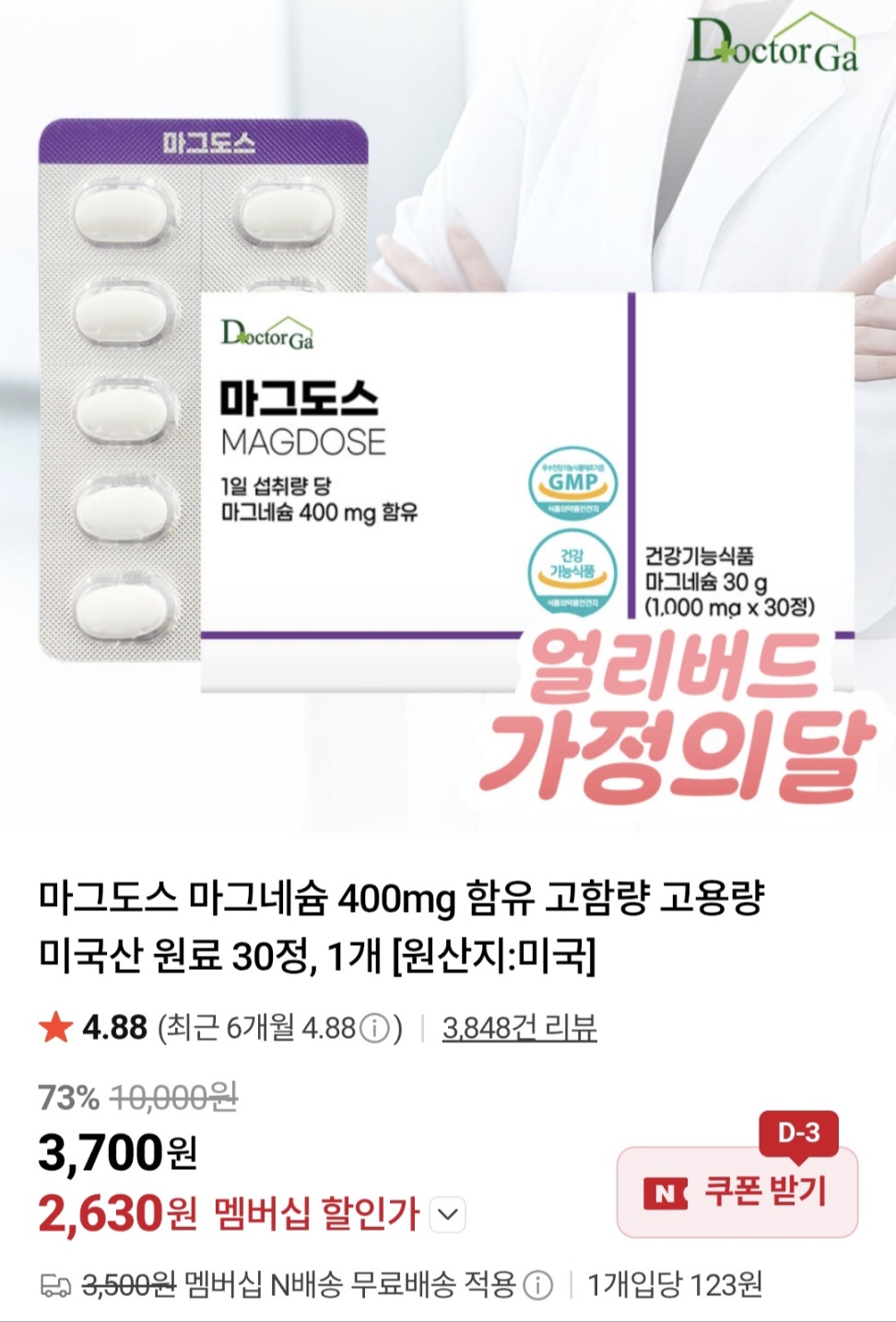 [네이버] 마그도스 마그네슘 400mg 함유 고함량 고용량 미국산 원료 30정 1개 (2,920원/네멤무료) > 국내핫딜