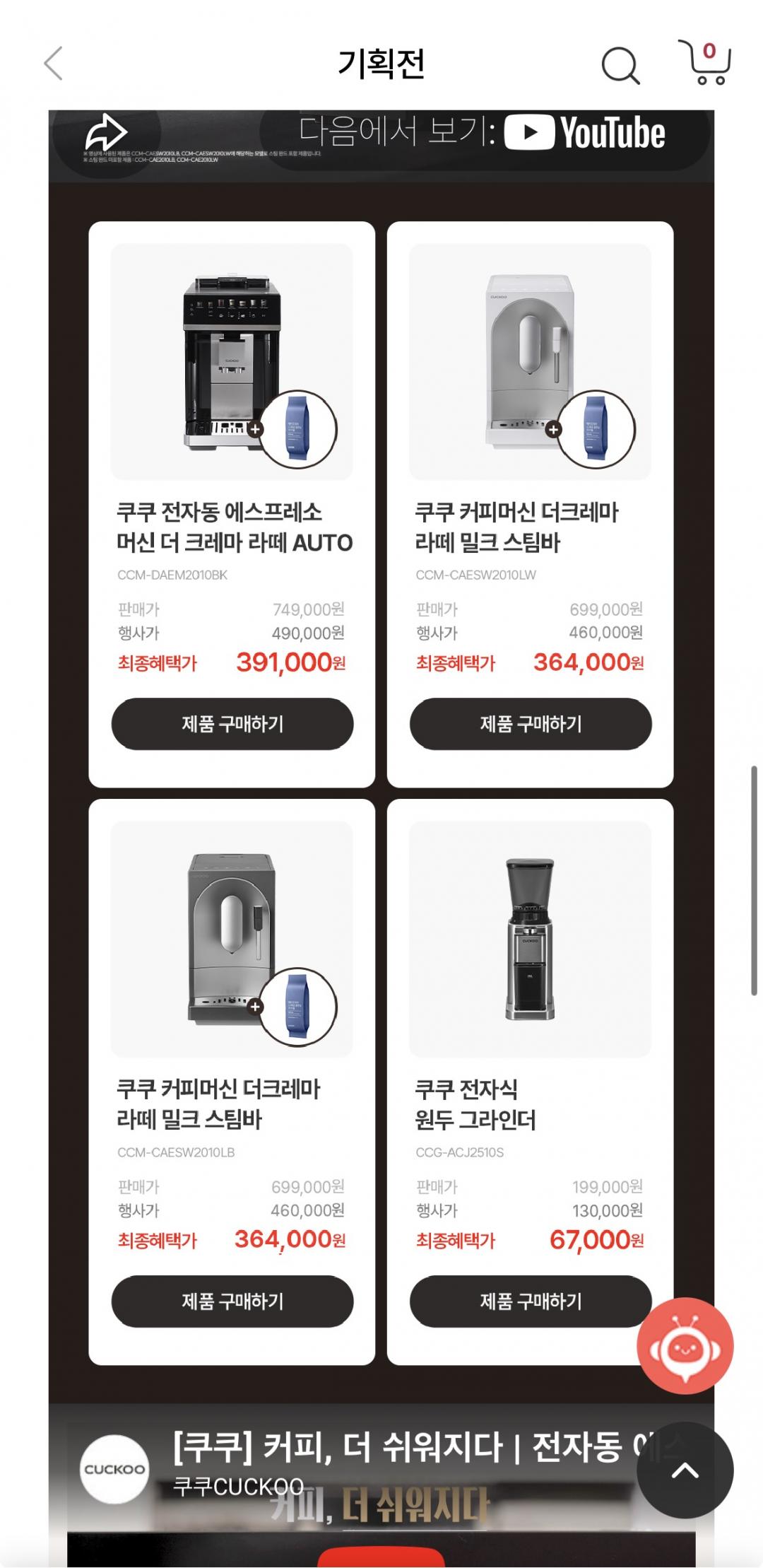 우유 스팀 가능한 쿠쿠 커피머신 라이브 할인해요.