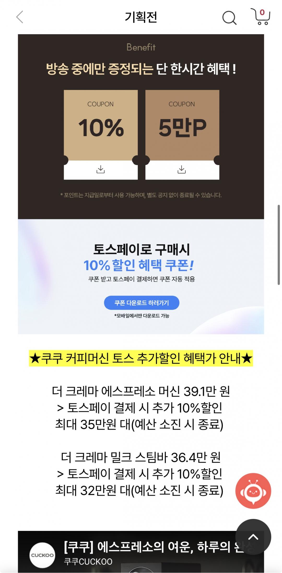 라이브 10% 쿠폰이랑 5만 포인트 있고 사은품으로 원두 200g 증정합니다.