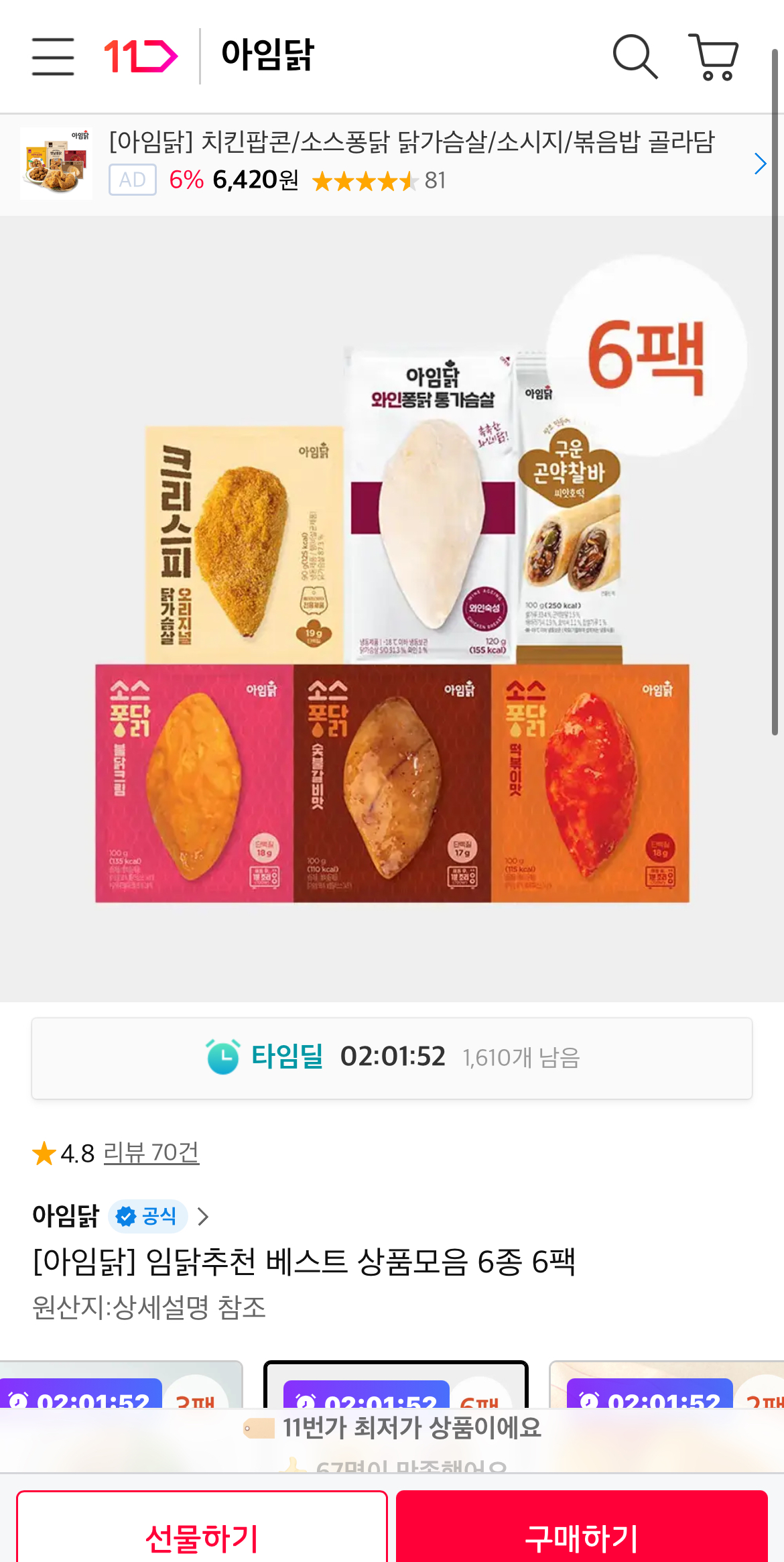 [11번가] 아임닭추천 베스트 상품모음 6종 6팩 (7,890원/유배)