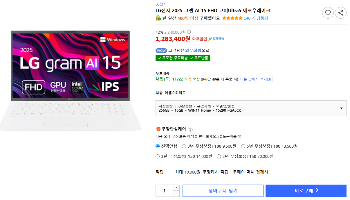 [쿠팡] 엘지 그램 15Z90T-GA5CK (1,283,400원/무료)
