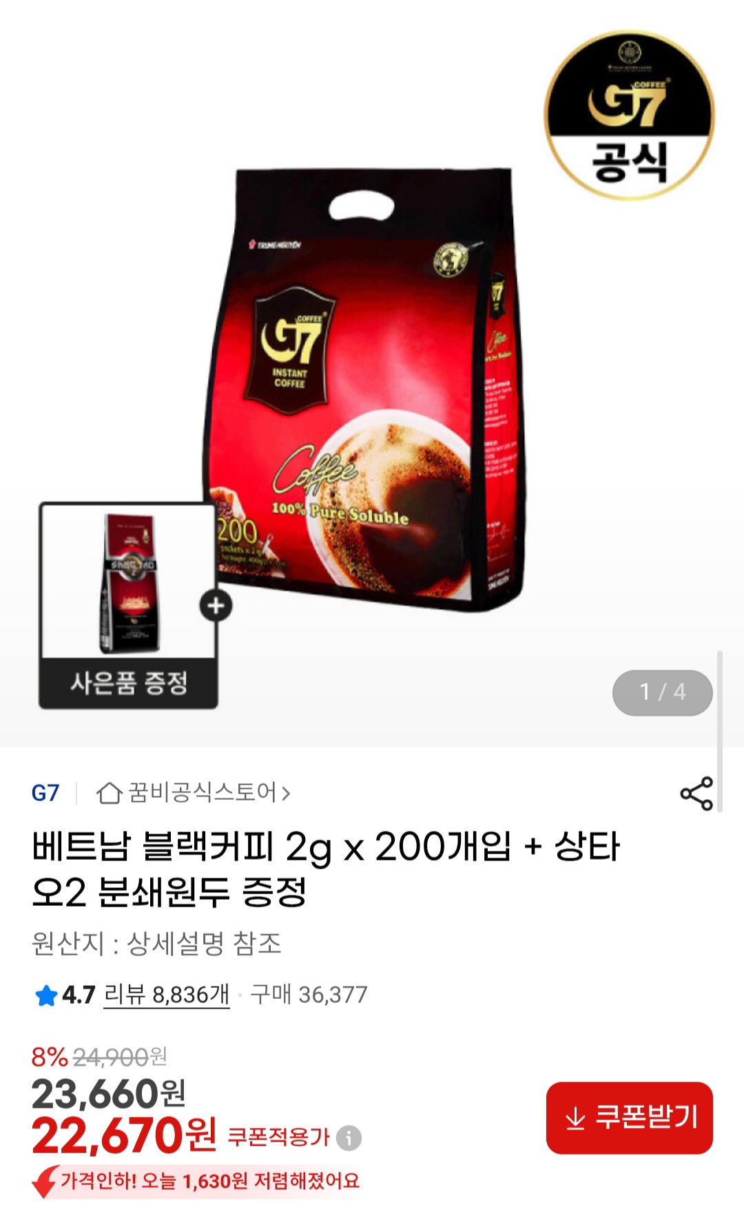 [지마켓] g7 퓨어블랙 커피 200개입 + 상타오2 분쇄원두 본품 증정 (22,670원/무배)