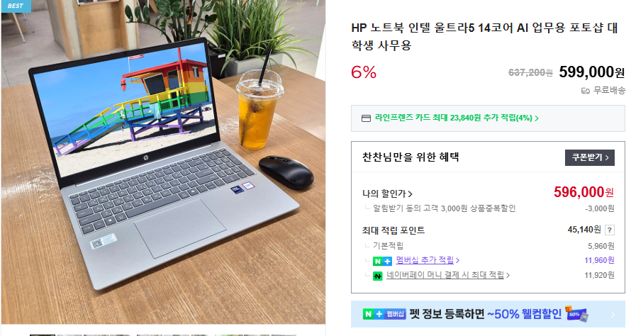 [네이버] HP 가성비 끝판왕 사무용 인강용 Ai 완벽 노트북 [55만원대/무료]
