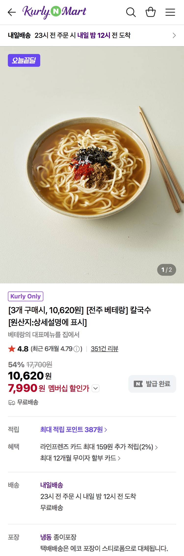 [네이버] 전주 베테랑 칼국수 3개 (7,990원/무배)