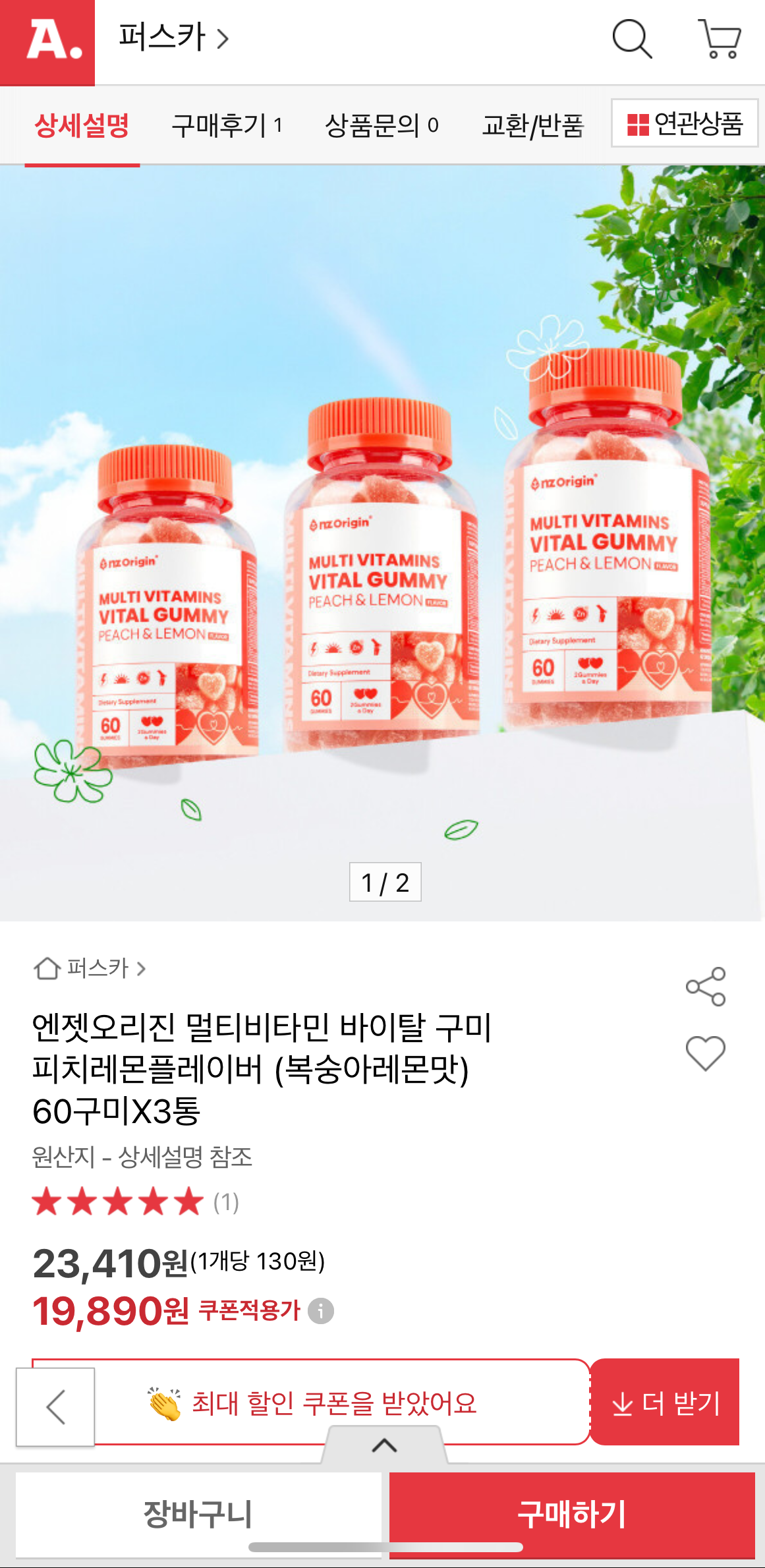 [옥션] 멀티비타민 바이탈 구미 피치레몬플레이버 60구미 3통 (19,890원/무료)