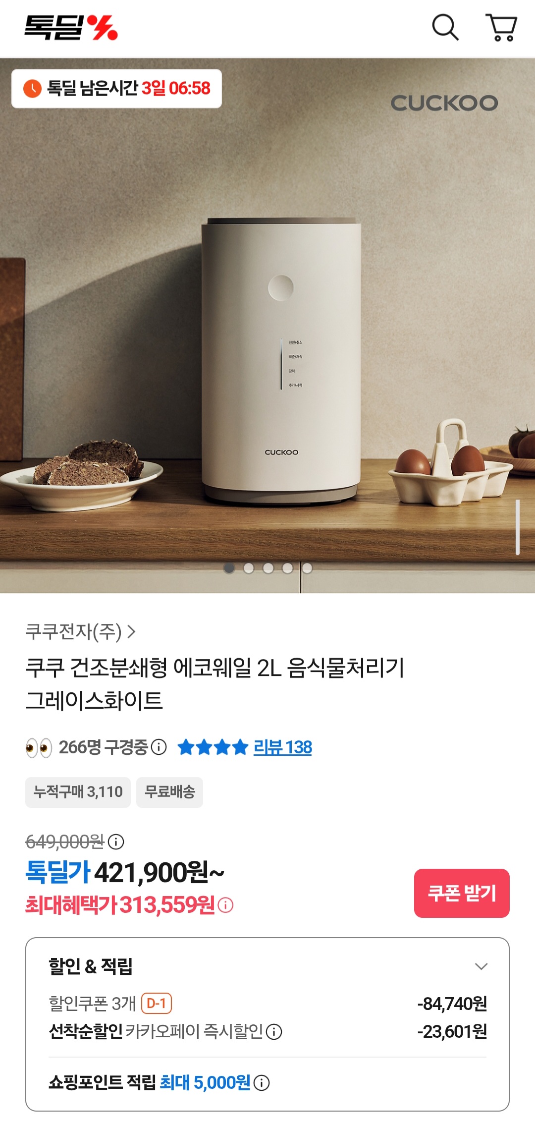 [톡딜] 쿠쿠 건조분쇄형 에코웨일 2L 음식물처리기 (313,554원/무배)