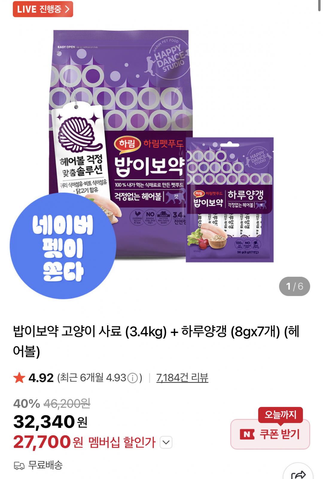 [네이버] 하림 밥이보약 3.4kg + 하루양갱 7개 (27,700원/무료)