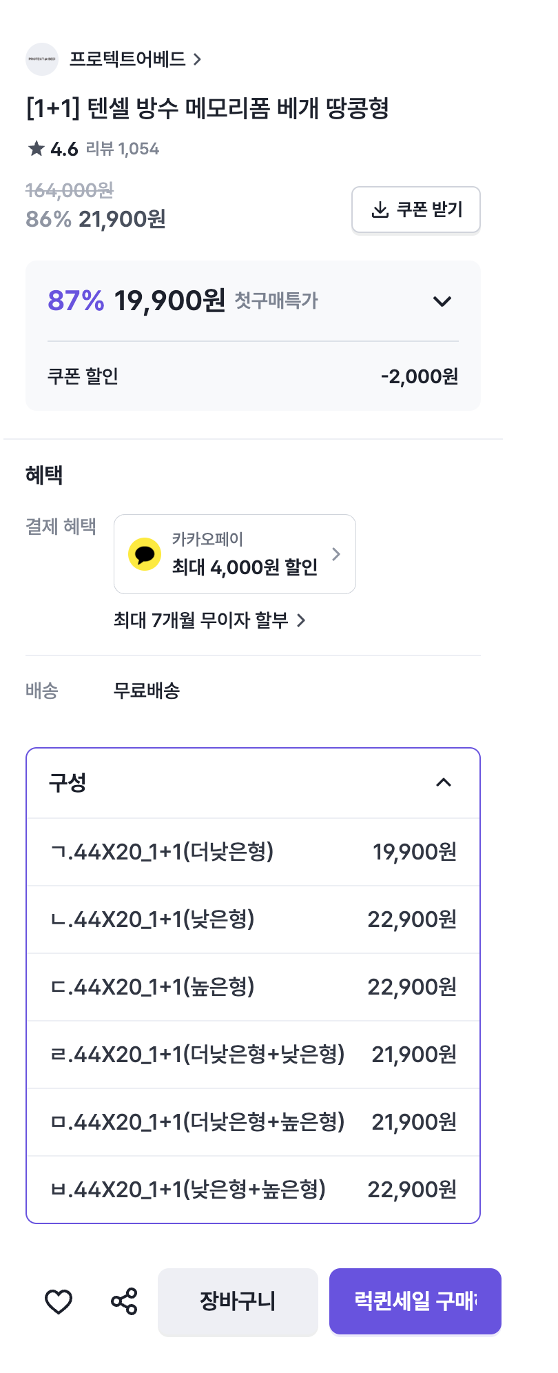 텐셀 방수 메모리폼 베개 땅콩형 1+1로 19,900원이에요