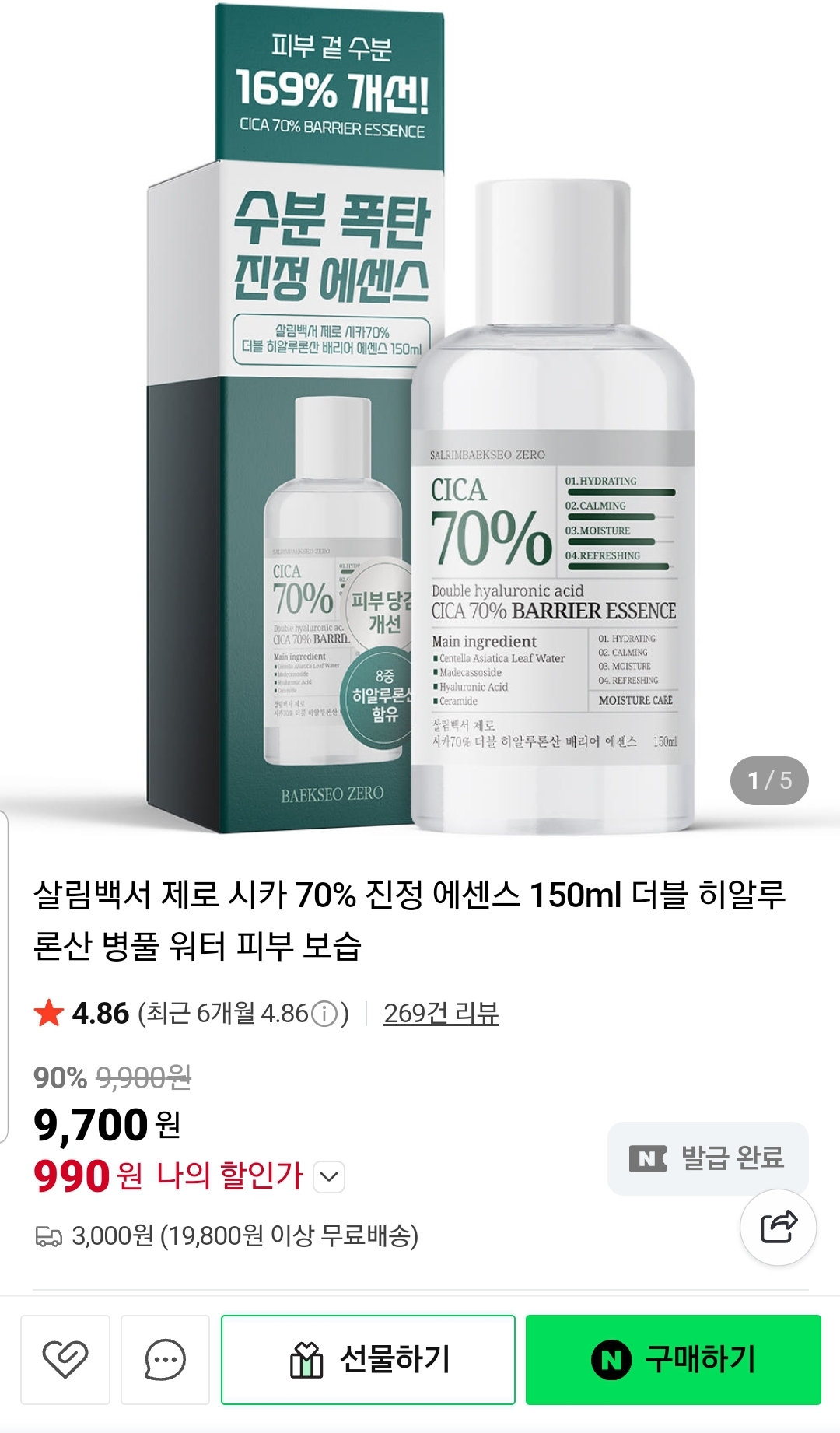 [네이버]살림백서 제로 시카 70% 진정 에센스 150ml 더블 히알루론산 (990원/3000원)