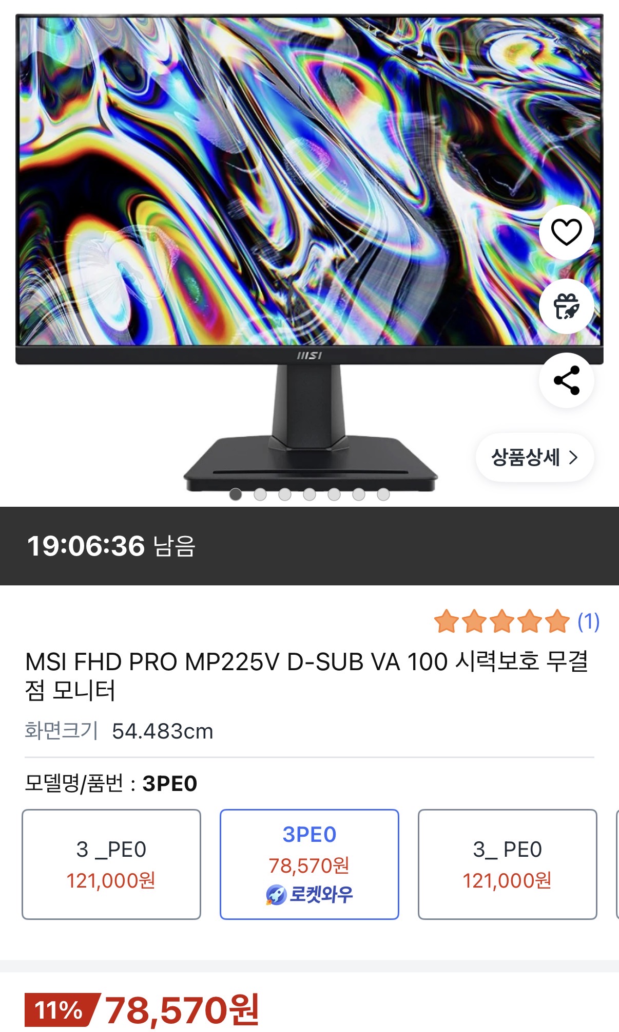 [쿠팡] MSI FHD PRO MP225V D-SUB VA 100 시력보호 모니터 무결점(78,570/무배)