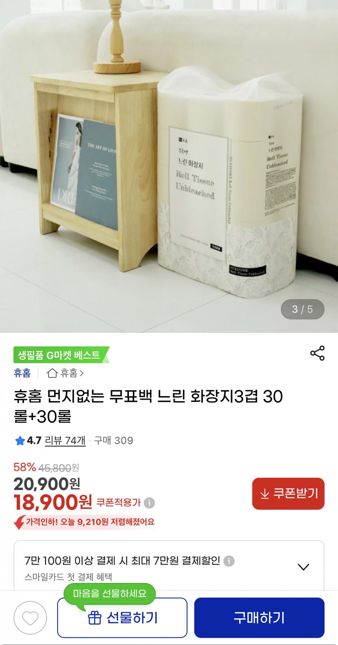 [G마켓] 먼지없는 무표백 느린 화장지 3겹 27m 30롤×2팩 (18,900원/무배)