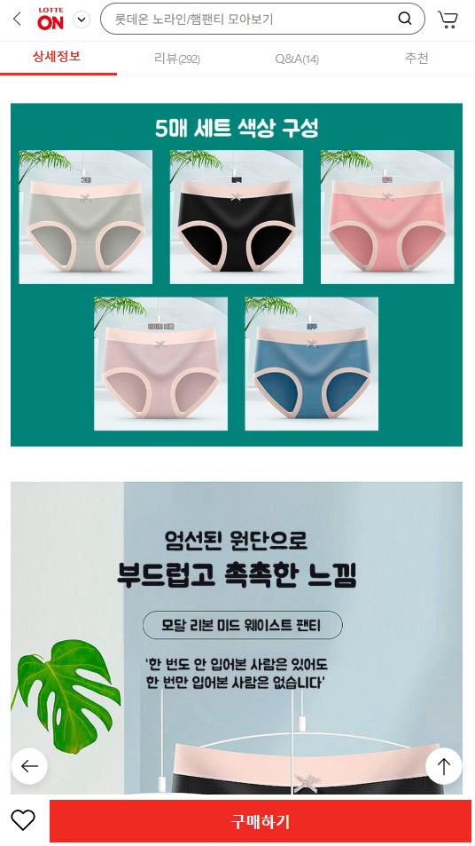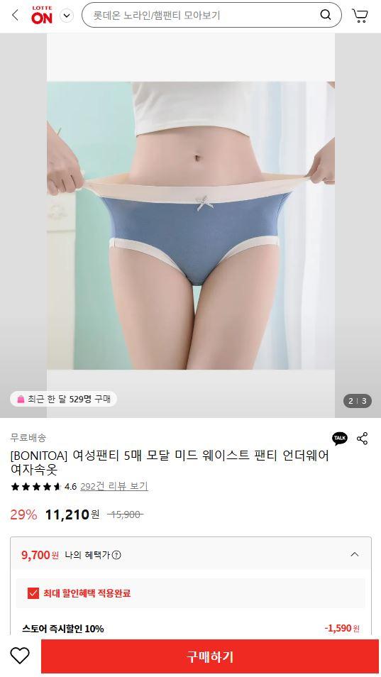 [롯데온] 핫딜 5장세트 심리스 모달 여성팬티 (9,700/무료)