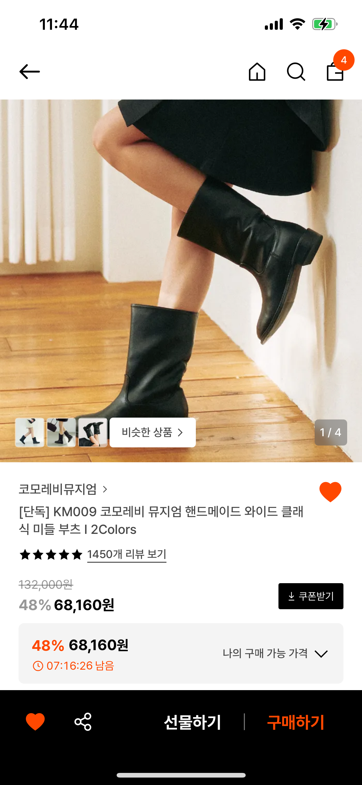 [29CM] 코모레비 뮤지엄 핸드메이드 와이드 클래식 미들 부츠 (68,160원 /배송비)