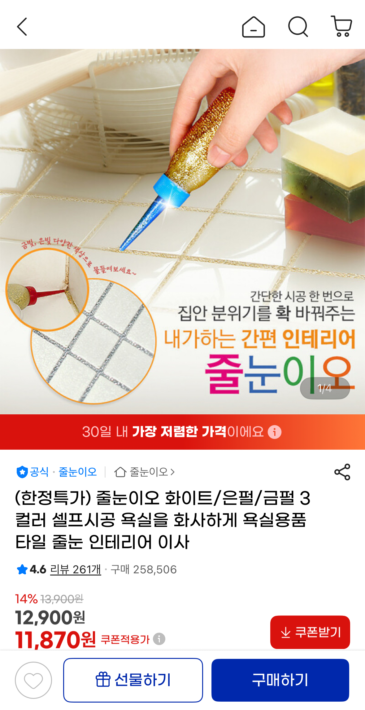 [지마켓] 줄눈이오 셀프 줄눈 시공 화이트/은펄/금펄 (11,870원/무배)