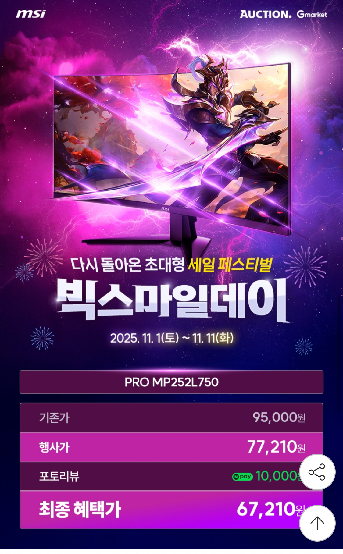 [G마켓] MSI MP252L750 IPS 100 시력보호 무결점 (77,210원/무배)