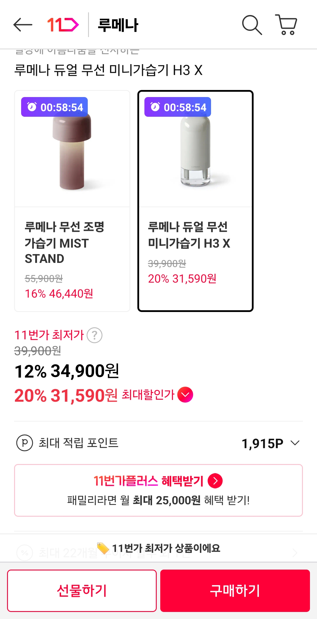 [11번가] 루메나 무선 가습기 MIST STAND, H3X (31,590원~/무배)