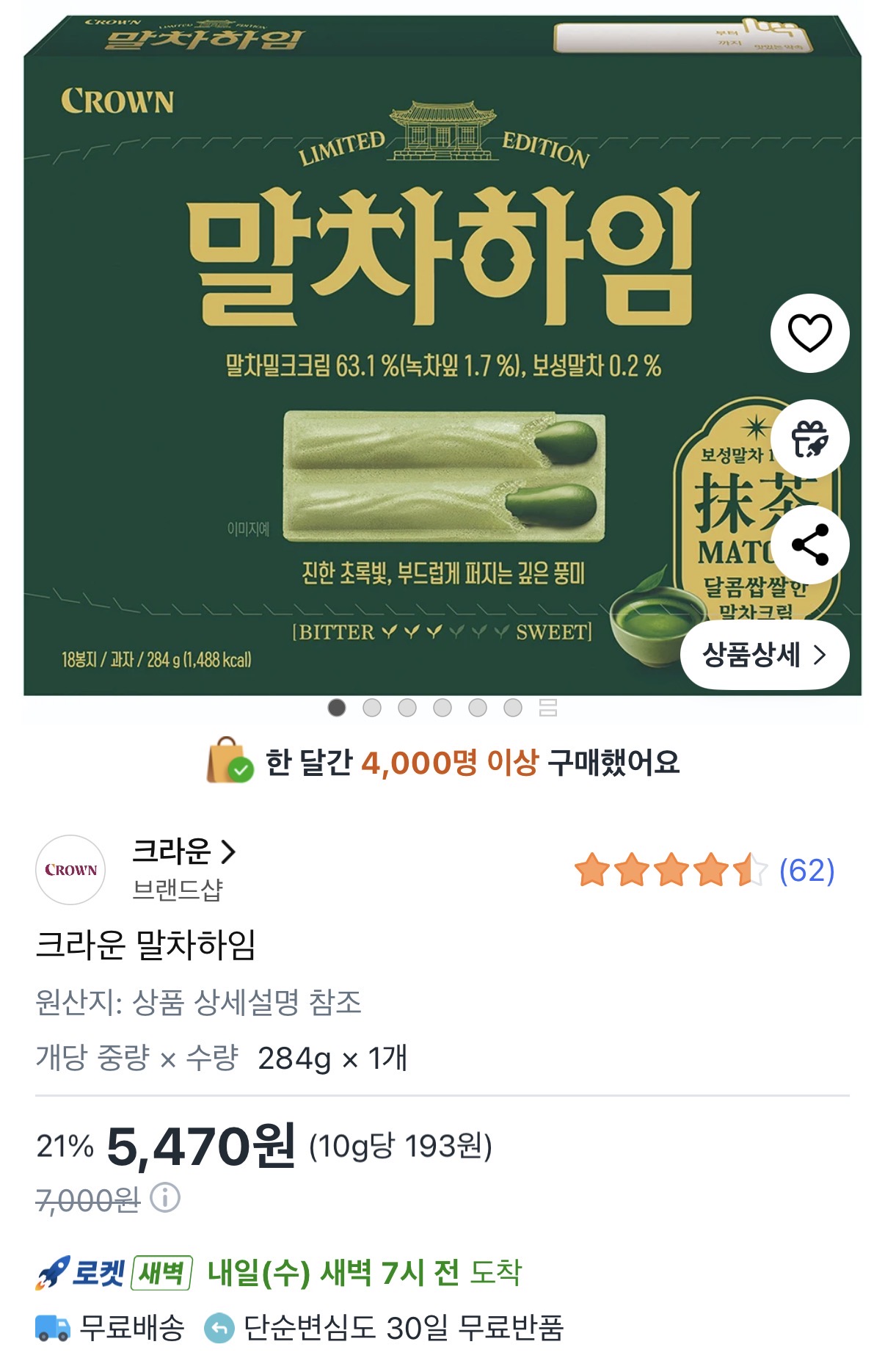 [쿠팡] 크라운 말차하임 284g 1개 (5,470원/와우무료)